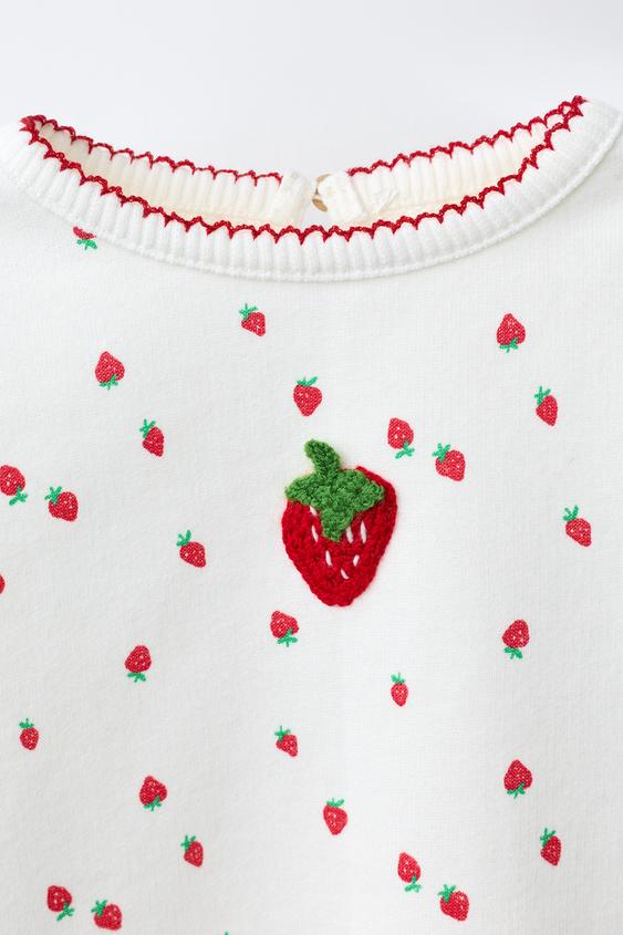 Толстовка с круглым вырезом и длинными рукавами. Застежка-капля на пуговице сзади. Принт «Клубника» и аппликация в виде клубники крючком на груди.