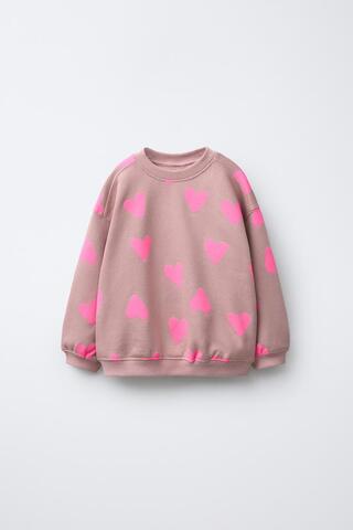 Толстовка с круглым вырезом и длинными рукавами. Отделка в рубчик. Принт с сердечками. Теплая и мягкая внутренняя подкладка с начесом. Основная ткань с хлопком