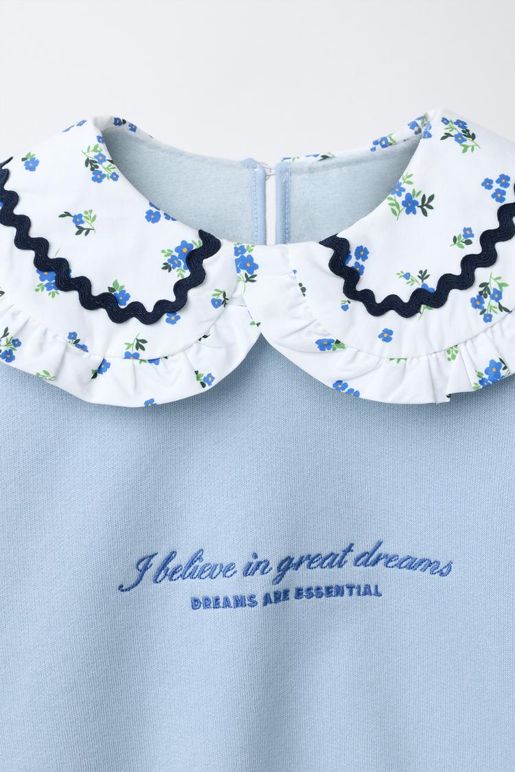 Толстовка с воротником-хомутом, волнистым краем, цветочным принтом и длинными рукавами. Отделка в рубчик. Вышитый текст спереди. Застежка на пуговицу-каплю сзади. Внутренняя часть с начесом, теплая и мягкая.