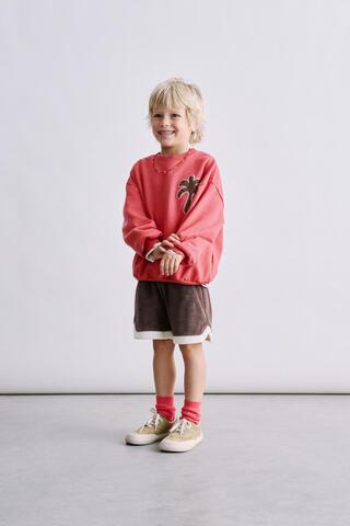 Толстовка с круглым вырезом и длинными рукавами. Детали в рубчик с вышивкой пальмы на груди и спине.
