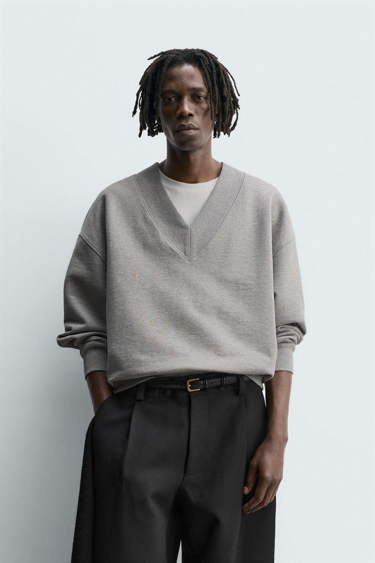 Толстовка свободного кроя из хлопковой ткани с махровой изнанкой. V-образный вырез и длинные рукава. Отделка в рубчик.