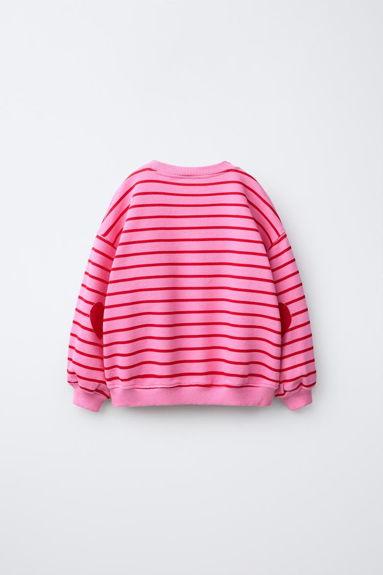 Толстовка с круглым вырезом и длинными рукавами. Отделка в рубчик. Принт в полоску и нашивки на локтях в форме сердца.