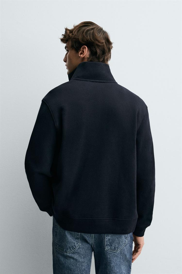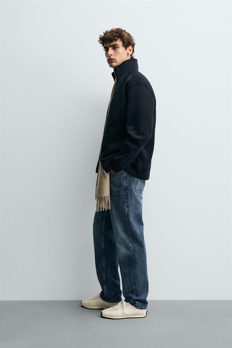 Толстовка-куртка классического кроя из плотного хлопка. Высокий воротник, длинные рукава. Прорезные карманы на бедрах. Детали в рубчик. Застежка-молния.