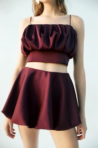 Укороченный топ из атласной ткани. Прямой вырез с рюшами и тонкими регулируемыми бретелями. Сбоку потайная застежка-молния в шве.