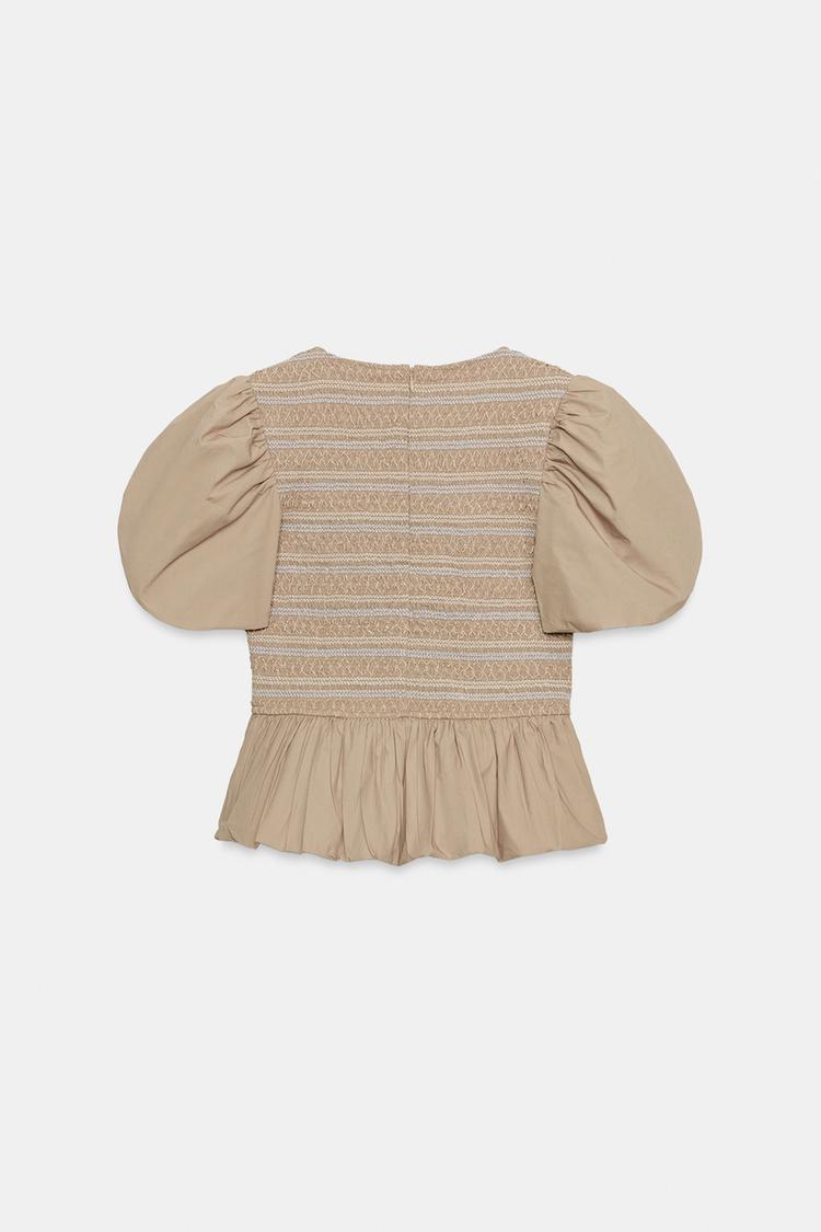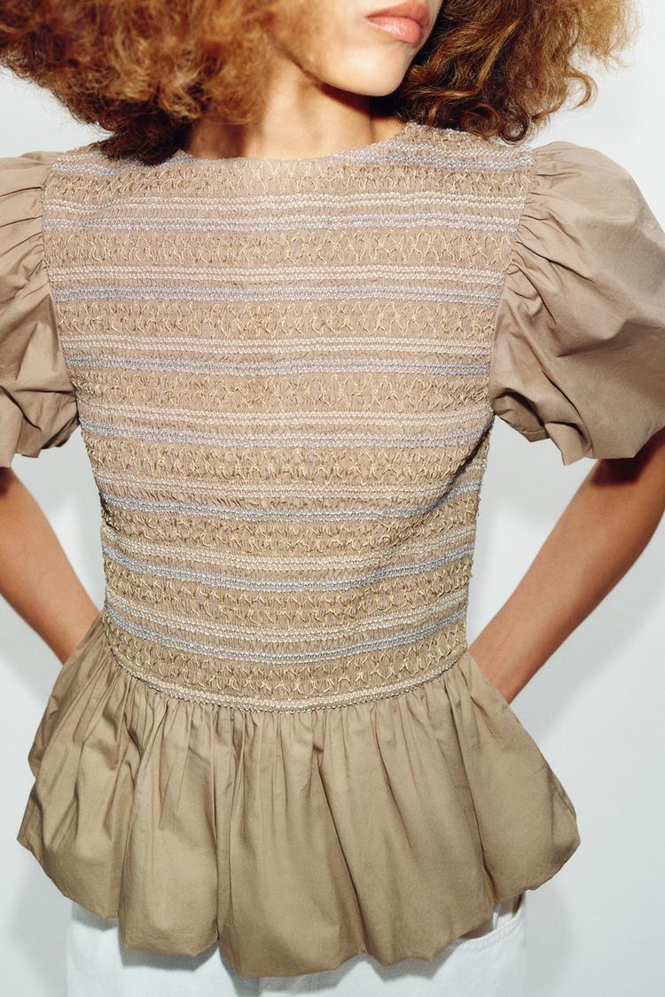 ZARA ТОП-БАЛЛОН С ВЫШИВКОЙ И ЖАТЫМ ЭФФЕКТОМ, ТЕМНО-БЕЖЕВЫЙ