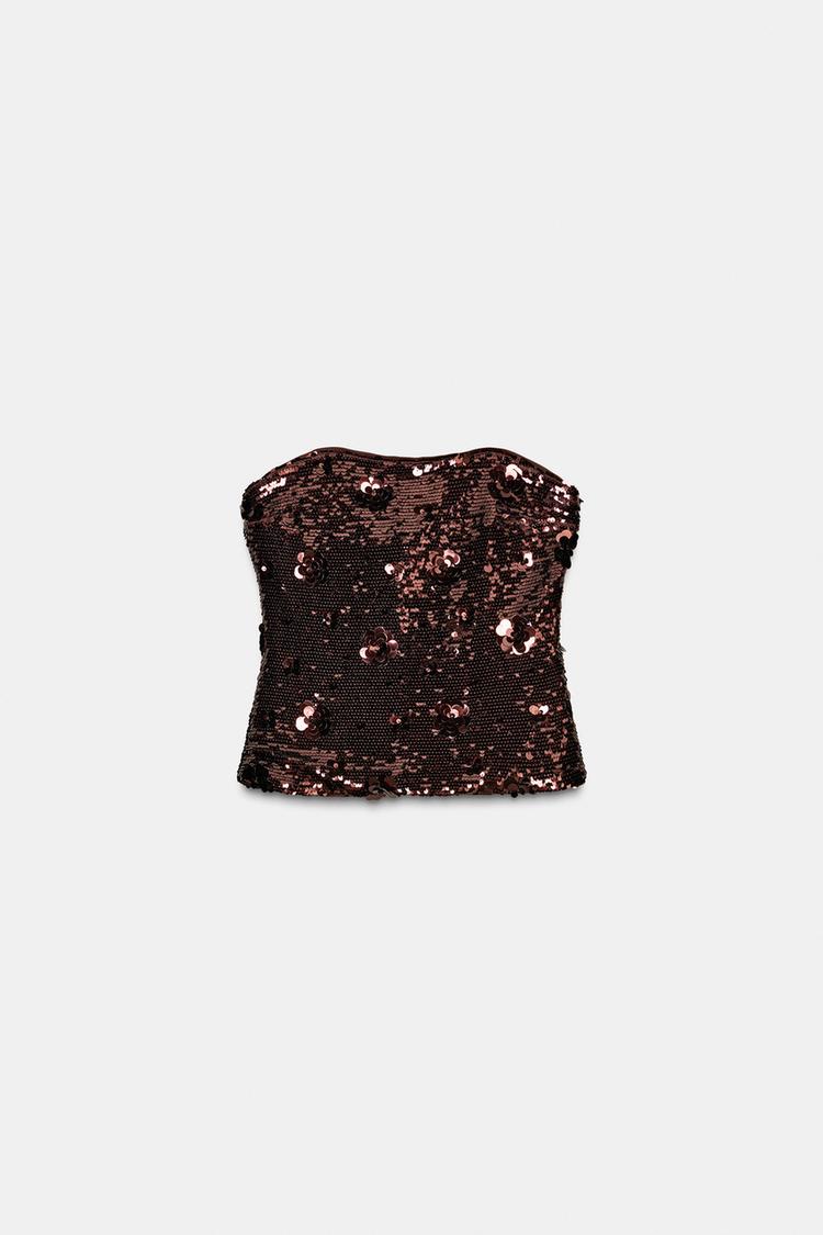 ZARA ТОП БЕЗ БРЕТЕЛЕЙ С ПАЙЕТКАМИ, ТЕМНО-КОРИЧНЕВЫЙ