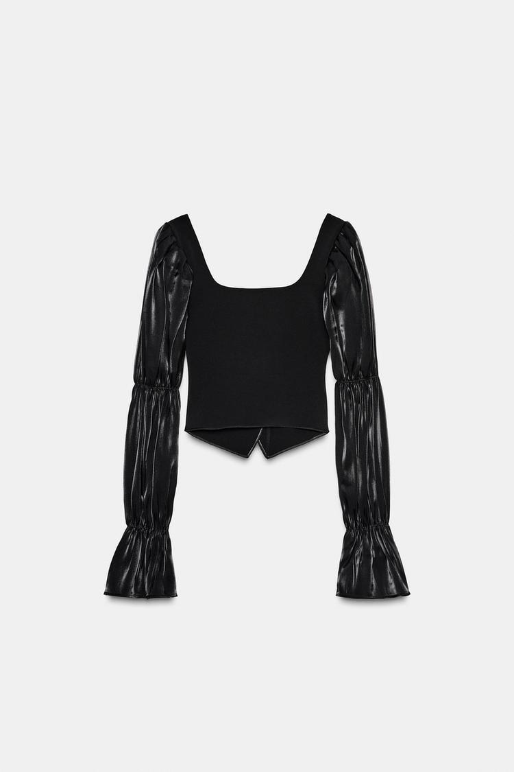 Топ с квадратным вырезом из эластичной ткани. Длинные рукава с резинками из комбинированной ткани в тон. Металлические пуговицы с рельефом спереди. Асимметричный низ.