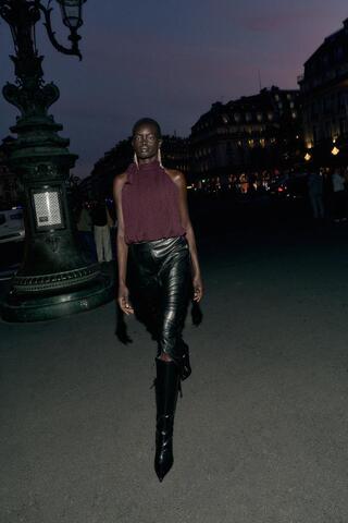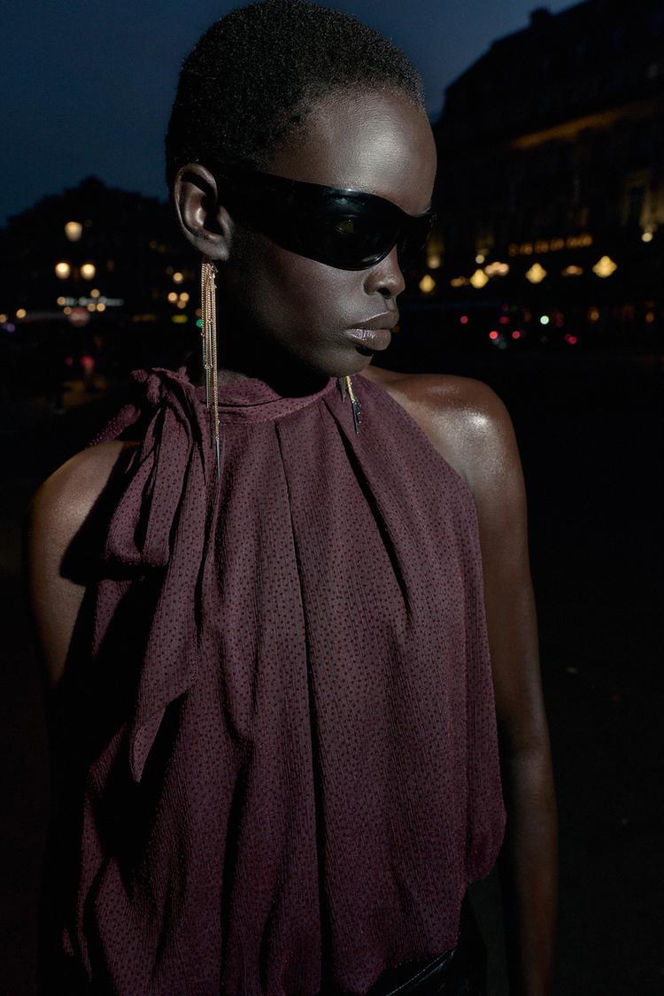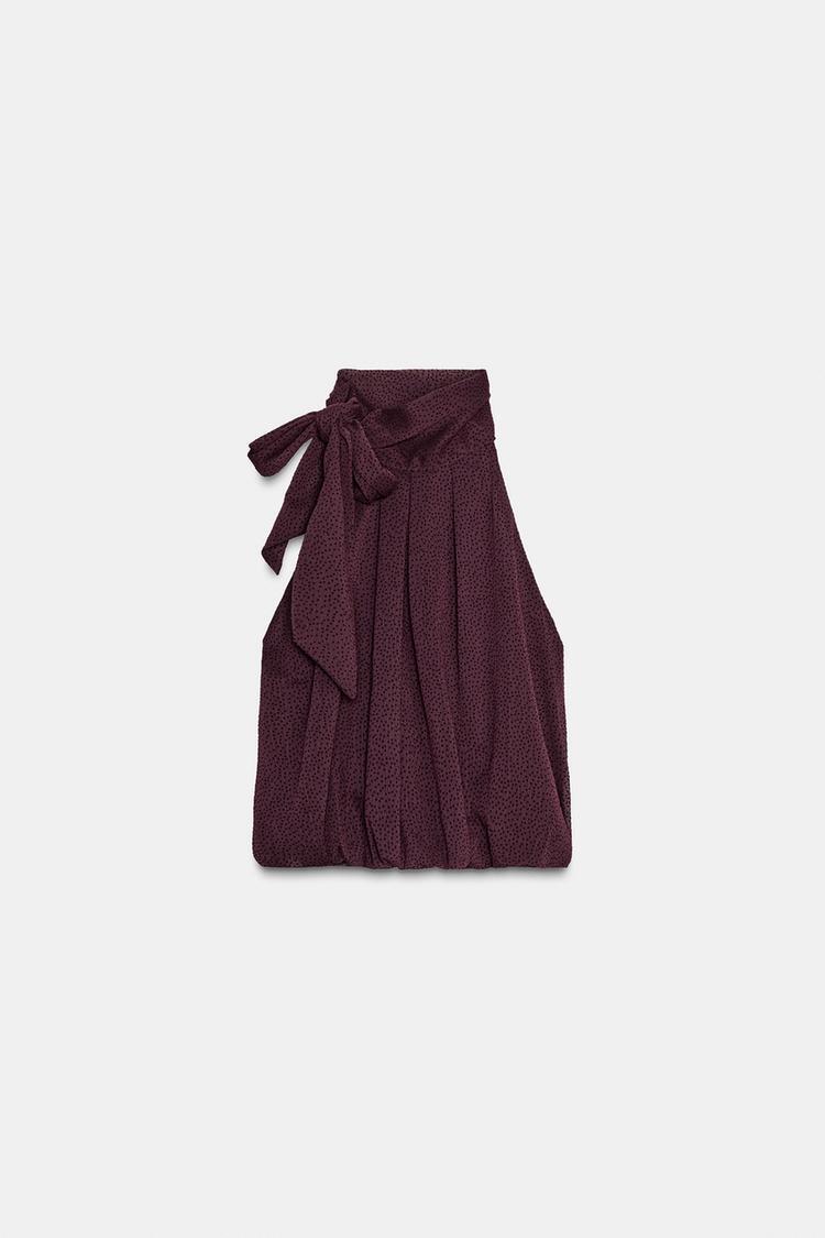 Топ с высоким воротником и завязками на шее. Фактурный материал в горошек. Объемный низ с внутренней резинкой.