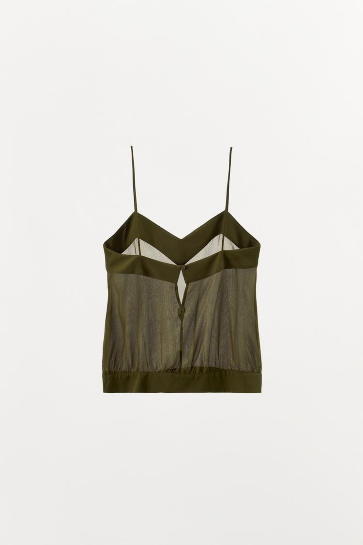 Полупрозрачный топ из 100% шелка. V-образный вырез, тонкие бретели. Застежка на обтянутую пуговицу сзади.
