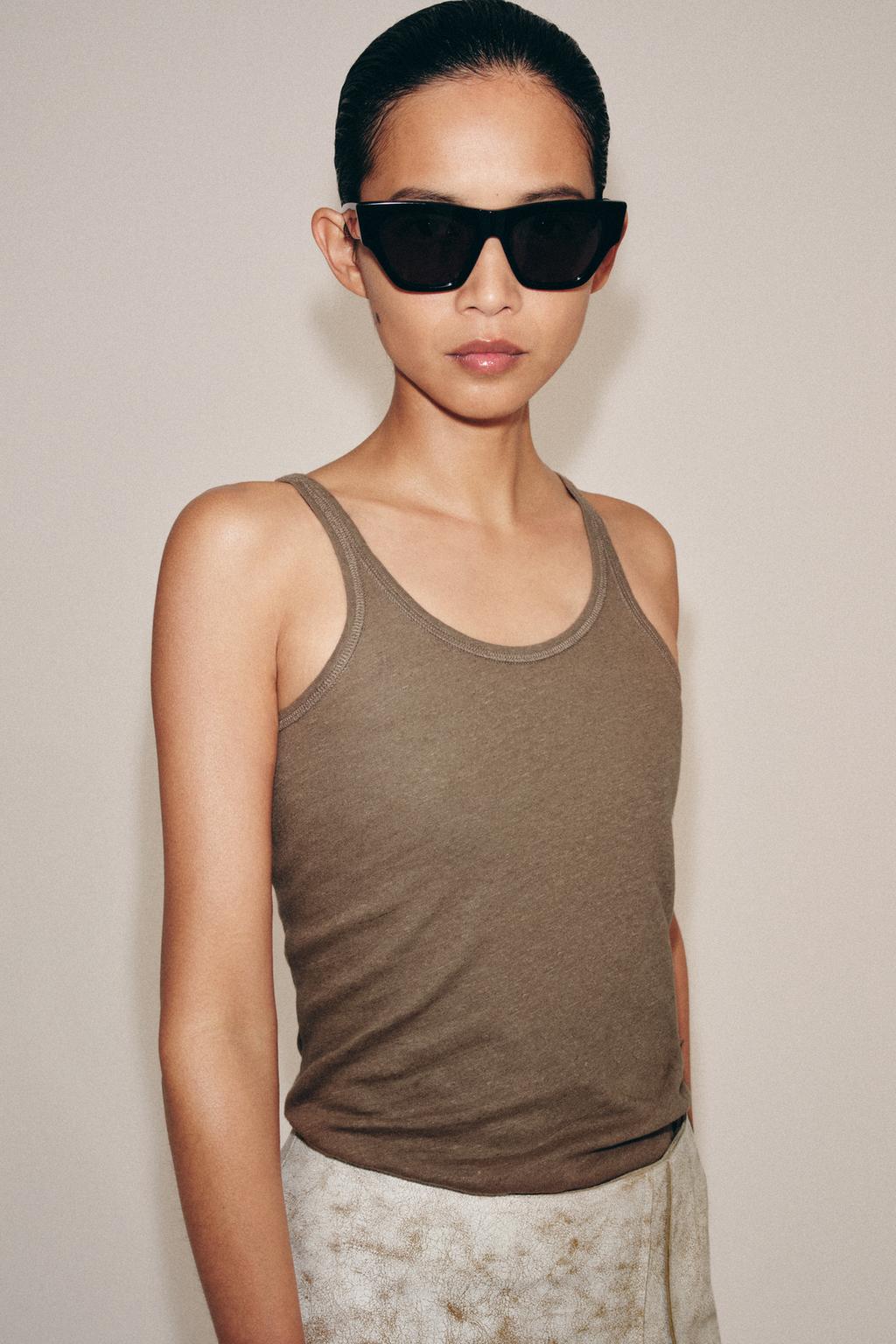 ZARA ТОП ИЗ ХЛОПКА И ЛЬНА, СВЕТЛО-КОРИЧНЕВЫЙ