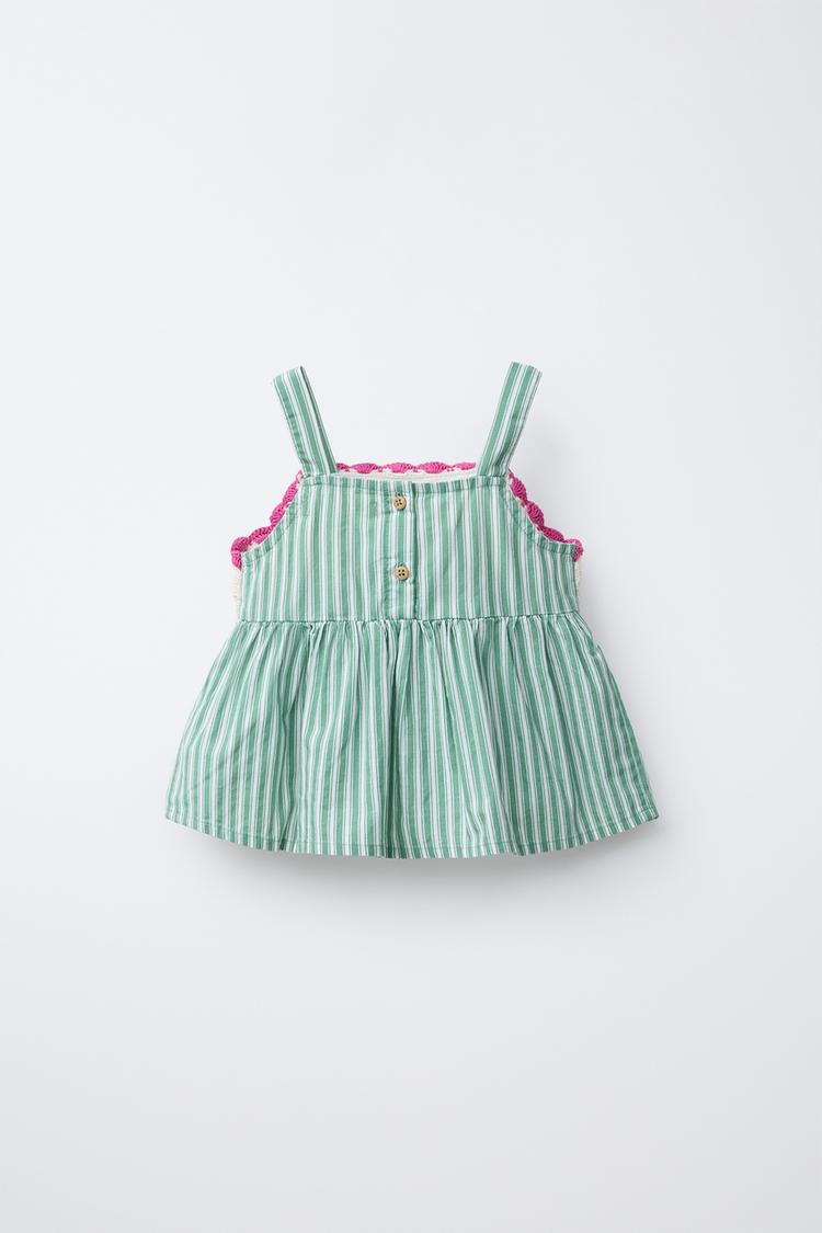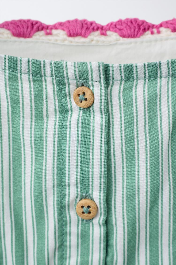 Топ с прямым вырезом и бретелями. Аппликация из цветов, выполненная в технике кроше, и полосатый принт. Застежка на пуговицы сзади.