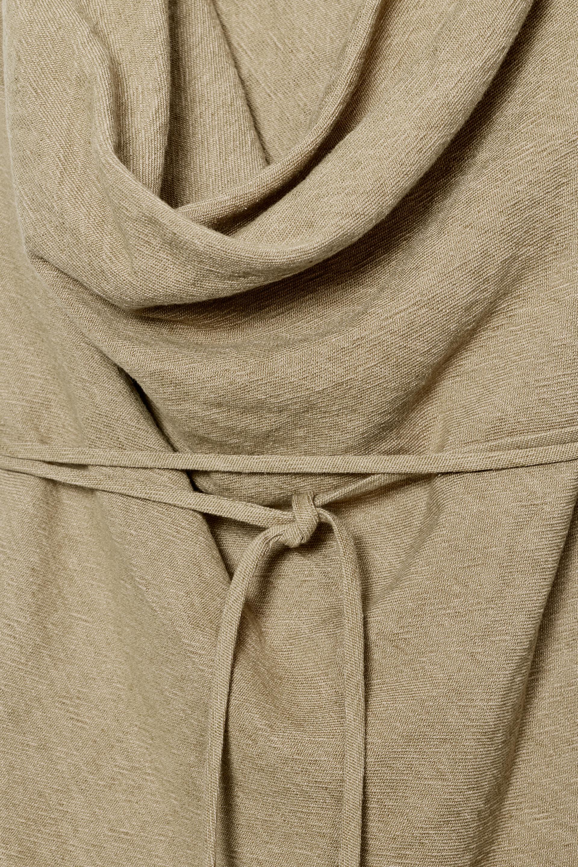 Топ из льняной ткани с вырезом-лодочкой и рукавами без пройм. Регулируемый завязывающийся пояс из той же ткани. Драпировка сзади.