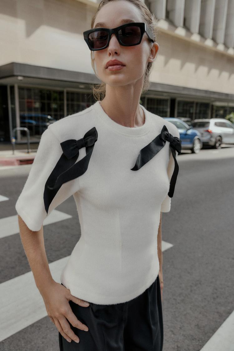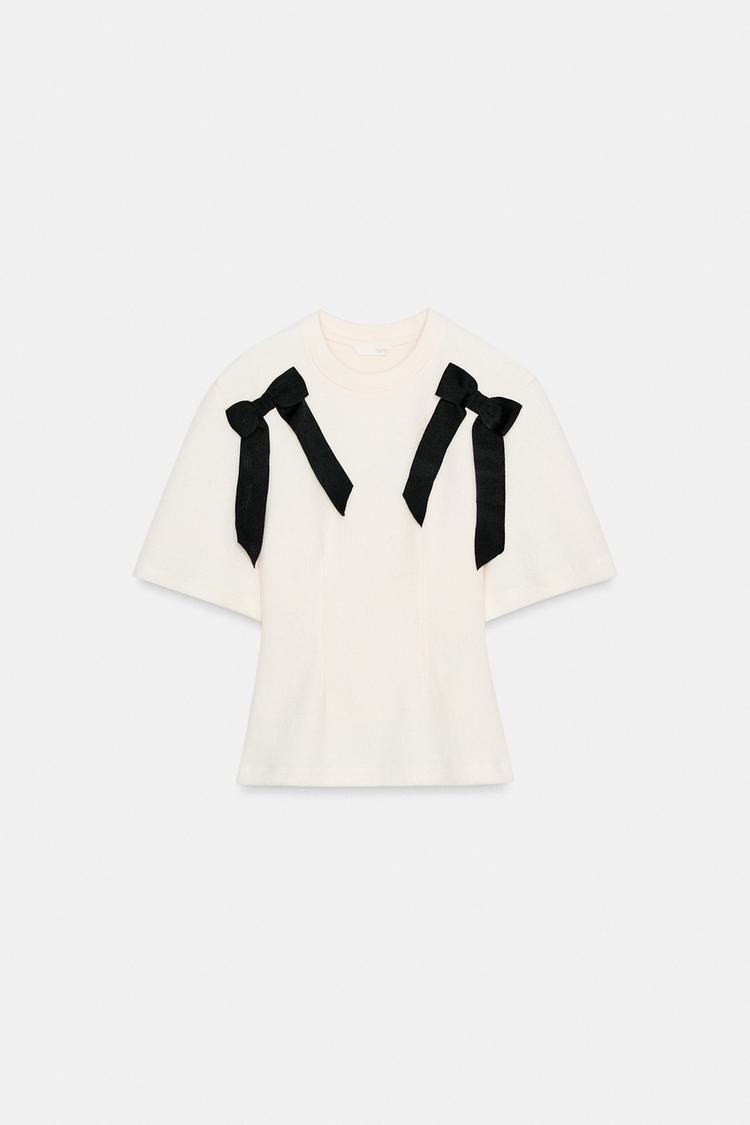 ZARA ТОП ИЗ МЯГКОЙ ТКАНИ С БАНТАМИ, ЖЕЛТОВАТО-БЕЛЫЙ