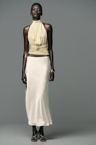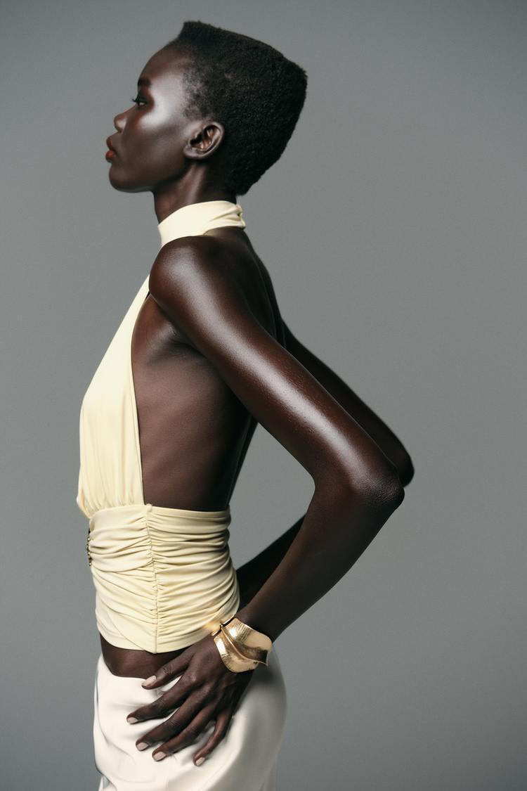 Топ из полиамида. Воротник халтер. Деталь со сборками. Открытая спина. Металлическая деталь в форме солнца спереди.