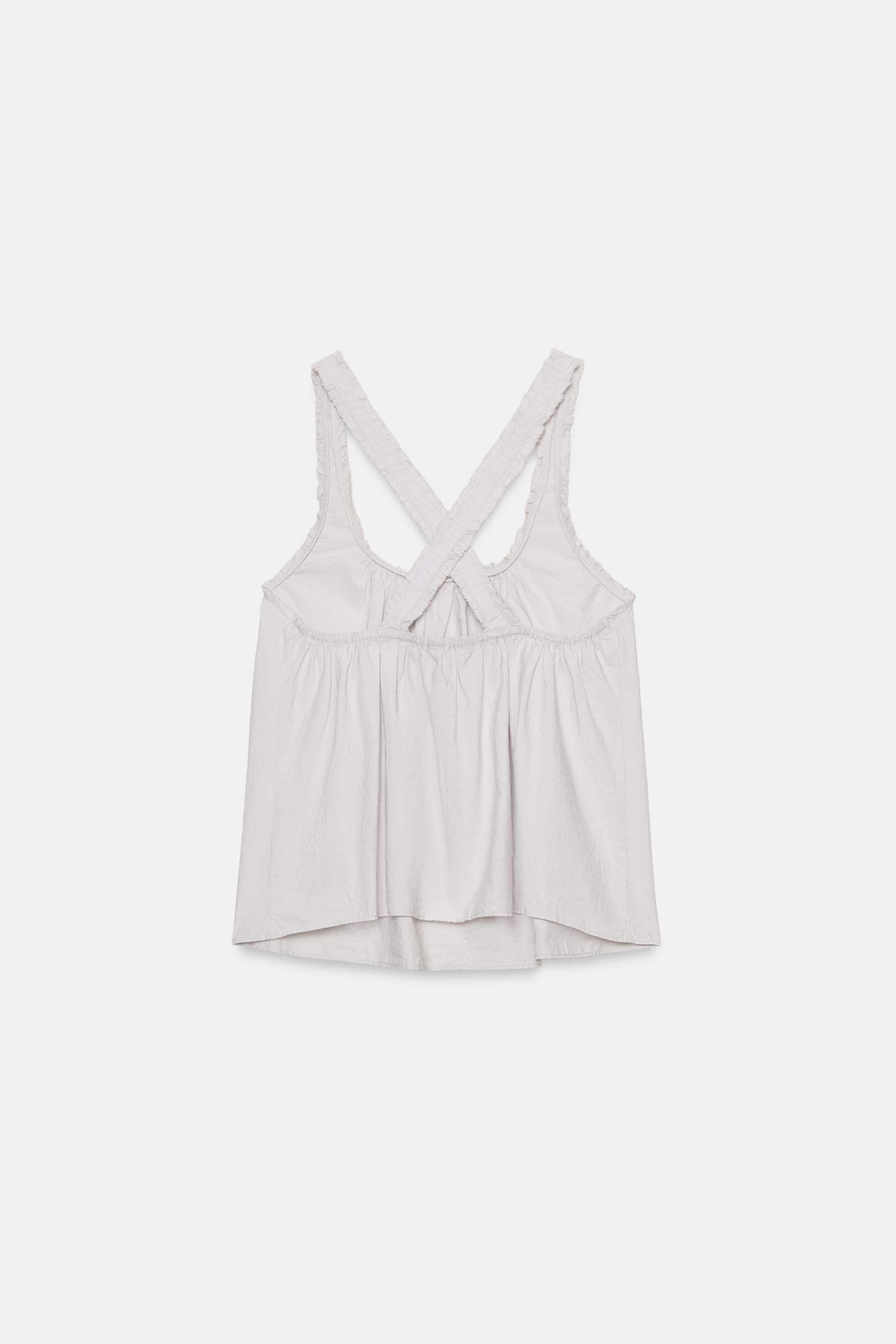 Топ с круглым вырезом и широкими бретелями на спине. Детали со сборками.