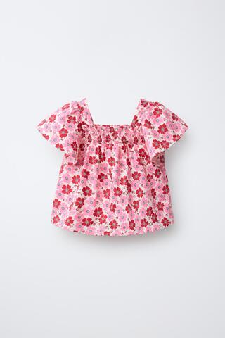 Топ с квадратным вырезом и короткими рукавами. Деталь в виде сот на кокетке. Цветочный принт.