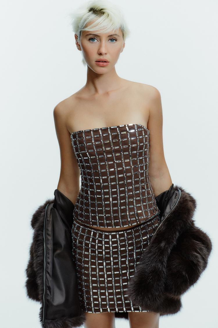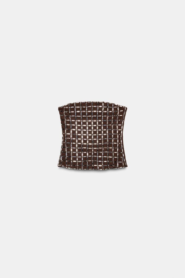 ZARA ТОП ИЗ СЕТКИ С БЛЕСТКАМИ И ОТКРЫТЫМИ ПЛЕЧАМИ, КОРИЧНЕВЫЙ