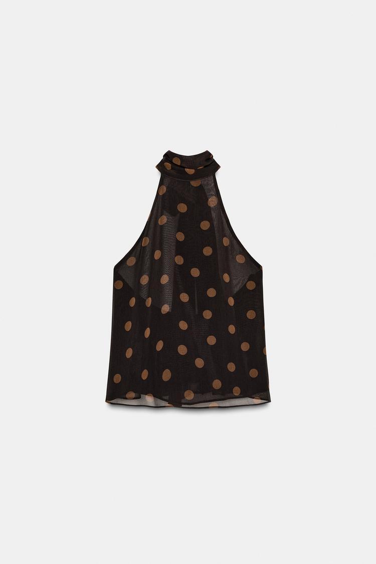ZARA ТОП ИЗ ЖОРЖЕТА С ГОРЛОВИНОЙ ХАЛТЕР В ГОРОШЕК, ОТТЕНКИ КОРИЧНЕВОГО