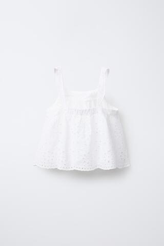 Топ с прямым вырезом и бретелями. Отделка шиффли и эластичная резинка сзади. Подкладка в тон.