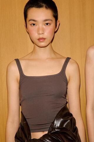 ZARA ТОП НА БРЕТЕЛЯХ ИЗ ХЛОПКА И МОДАЛА, СЕРОВАТО-КОРИЧНЕВЫЙ