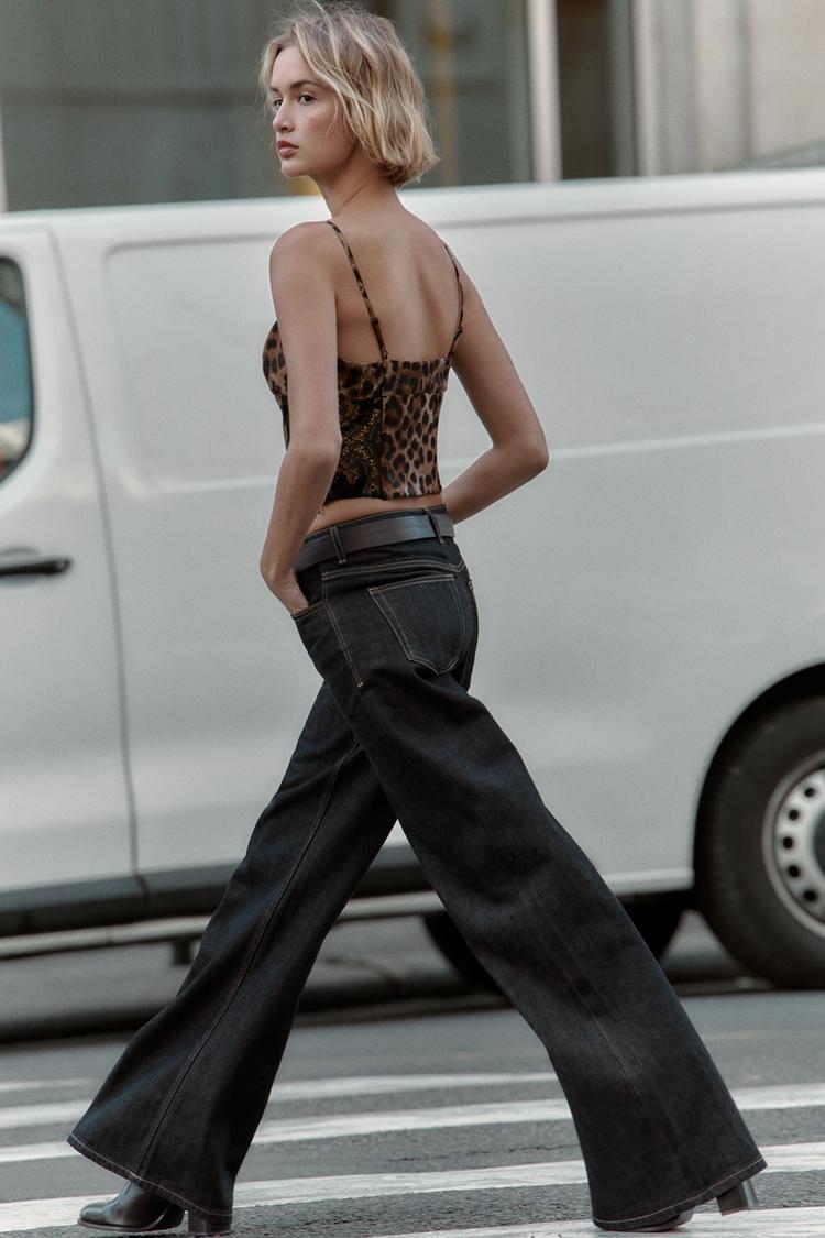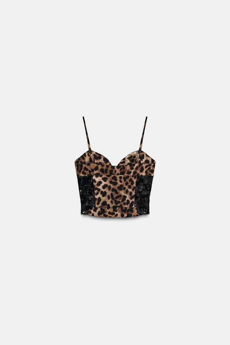 ZARA ТОП С АНИМАЛИСТИЧЕСКИМ ПРИНТОМ И КРУЖЕВОМ, ЛЕОПАРДОВЫЙ