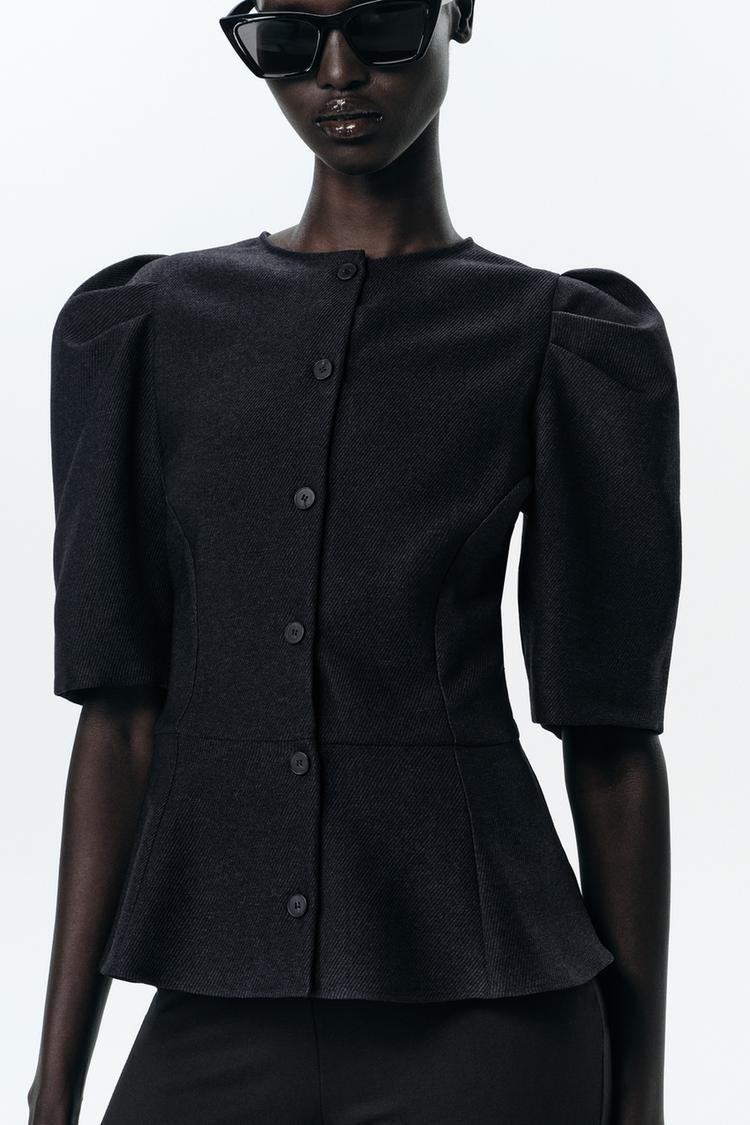 ZARA ТОП С БАСКОЙ И ОБЪЕМНЫМИ РУКАВАМИ, АНТРАЦИТОВО-СЕРЫЙ