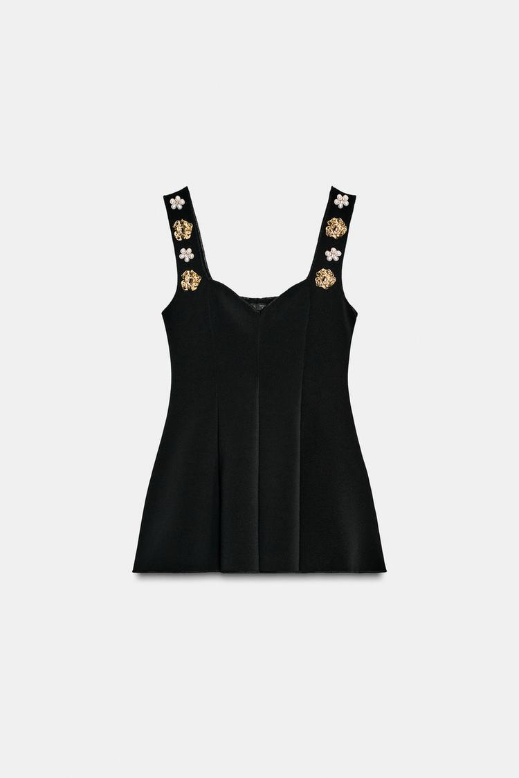 Топ из эластичной ткани. Вырез сердечком и широкие бретели. Отделка с ювелирными украшениями. Низ с баской.