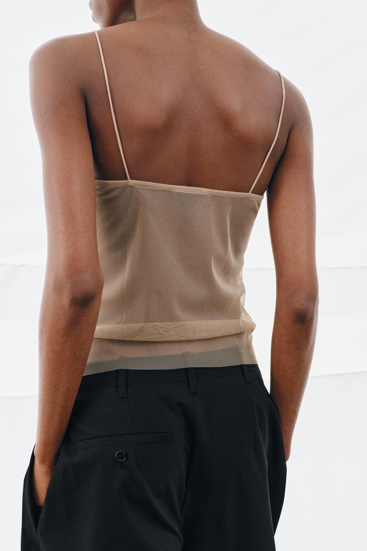 Топ с прямым вырезом и тонкими бретелями. Декорирован бусинами и пайетками.