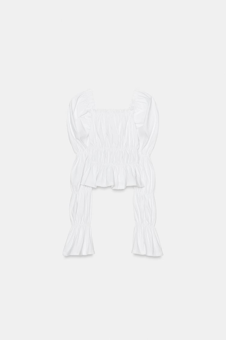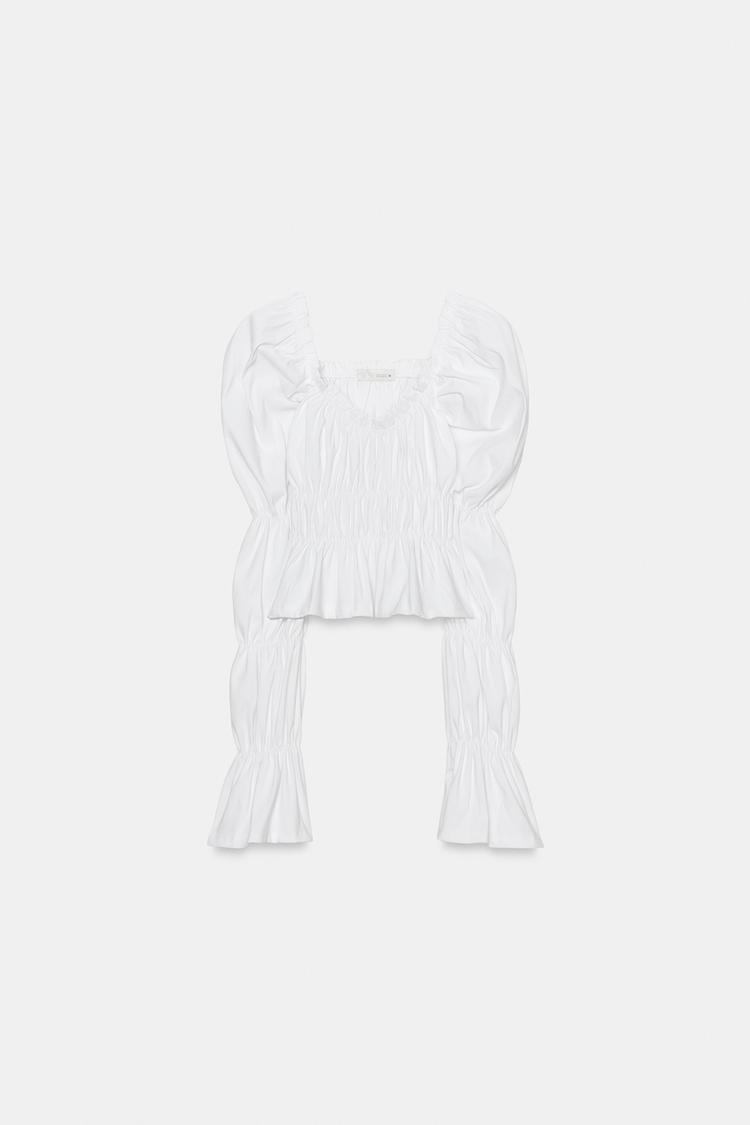 ZARA ТОП С ЭЛАСТИЧНЫМИ СБОРКАМИ И ОБЪЕМНЫМИ РУКАВАМИ, БЕЛЫЙ