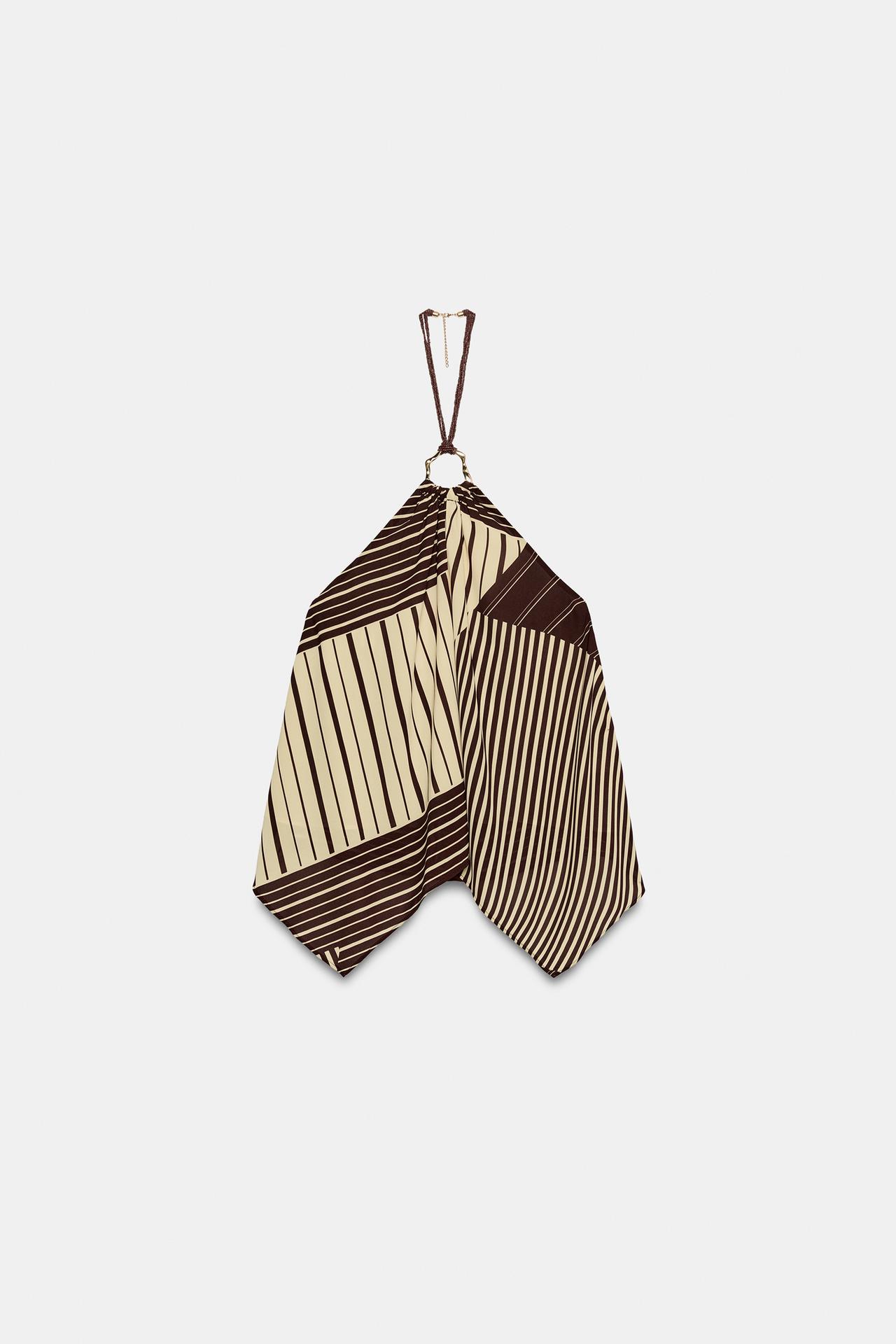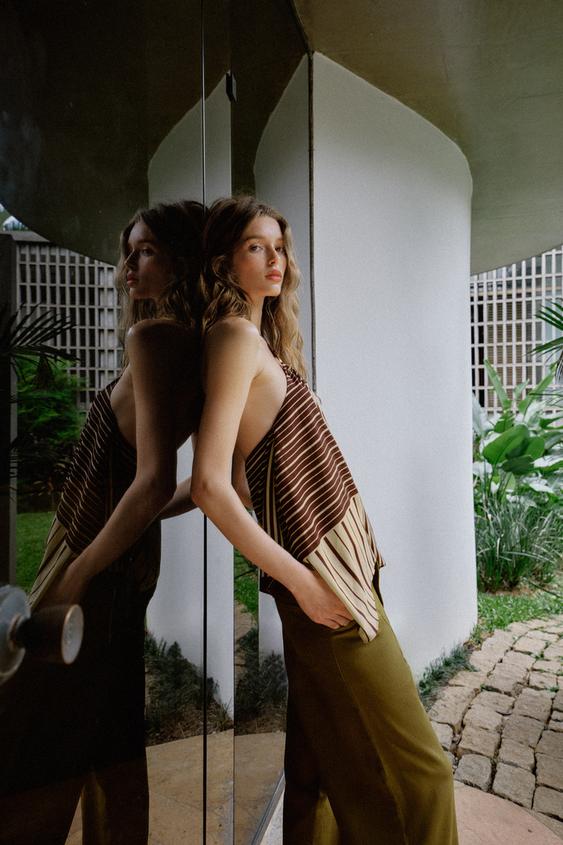 ZARA ТОП С ГОРЛОВИНОЙ ХАЛТЕР И БУСИНАМИ, ЭКРЮ/КОРИЧНЕВЫЙ