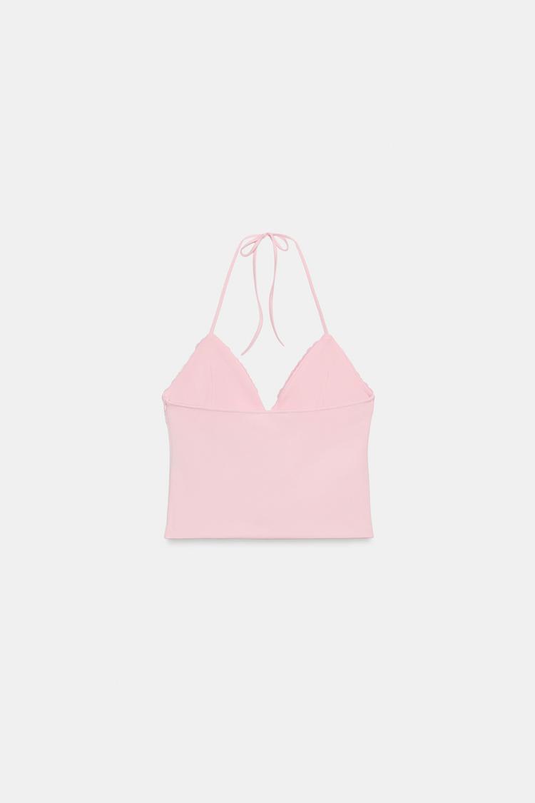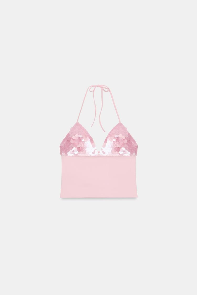 ZARA ТОП С ГОРЛОВИНОЙ ХАЛТЕР И ПАЙЕТКАМИ, ПАСТЕЛЬНО-РОЗОВЫЙ