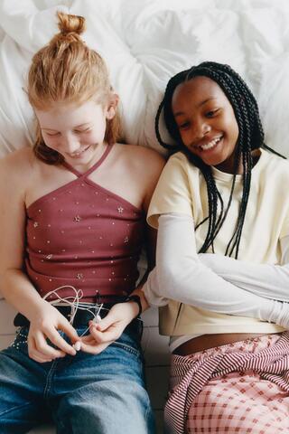 Топ с горловиной халтер и перекрещенными на спине бретелями. Декорирован заклепками.