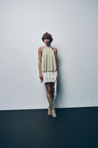 Топ с горловиной халтер и завязками в виде платка. На подкладке. Боковая застежка-молния, скрытая в шве.