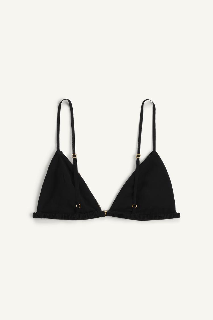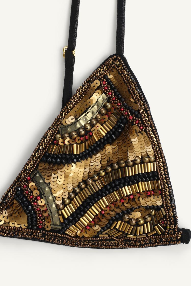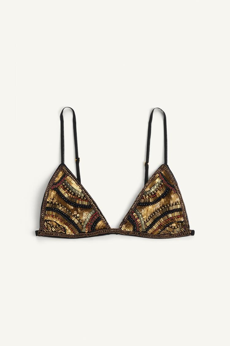 Топ с тонкими регулируемыми бретельками. Вышитые детали с аппликацией из бисера. Металлический крючок сзади.