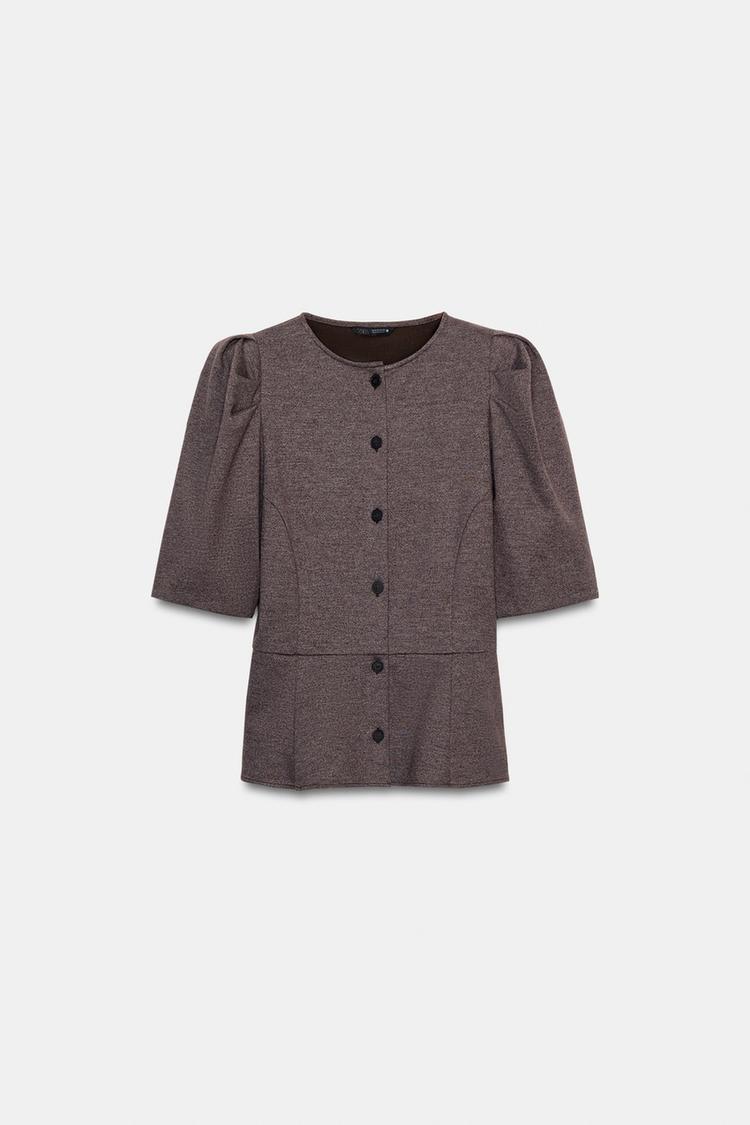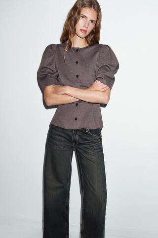ZARA ТОП С ОБЪЕМНЫМИ РУКАВАМИ, КОРИЧНЕВЫЙ МЕЛАНЖ