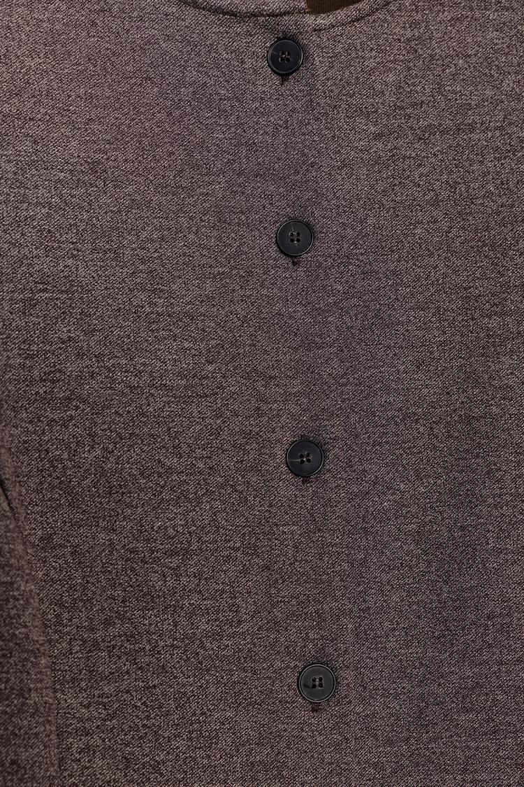 Топ с круглым вырезом и объемными рукавами со сборками на плечах. Расклешенный низ. Застежка на пуговицы спереди.