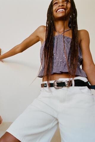 Топ с воротником-халтер и бретелями. Эластичная резинка на груди и спине. Отделка пайетками.