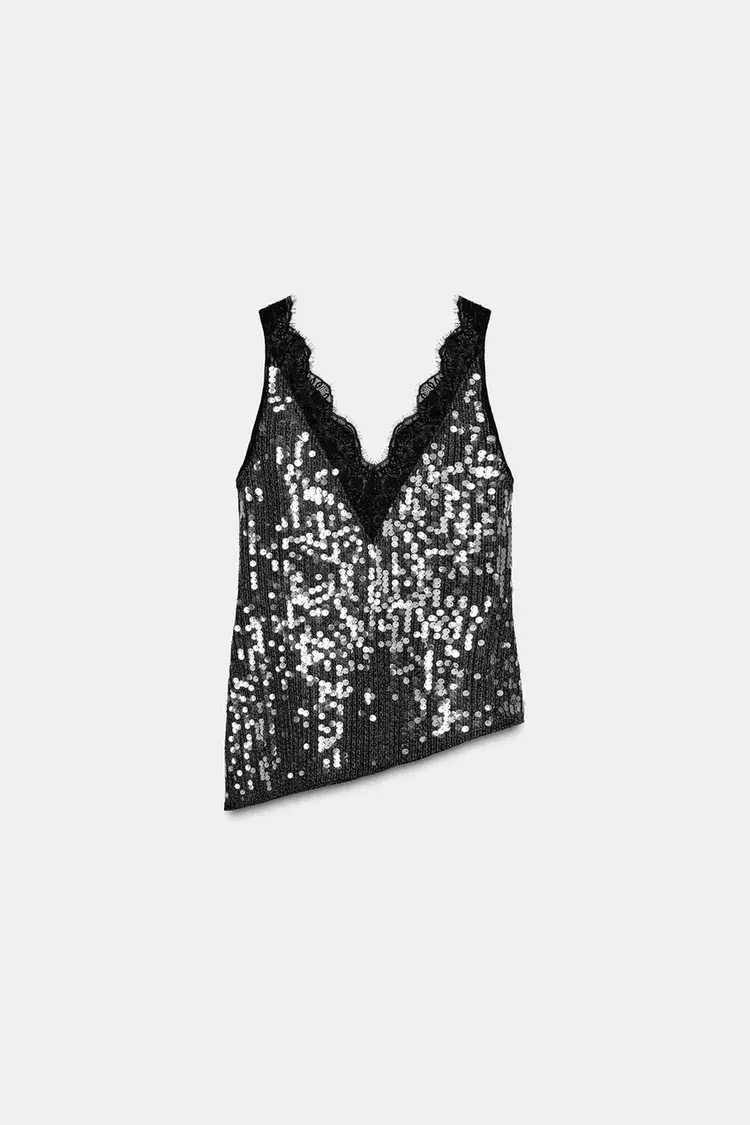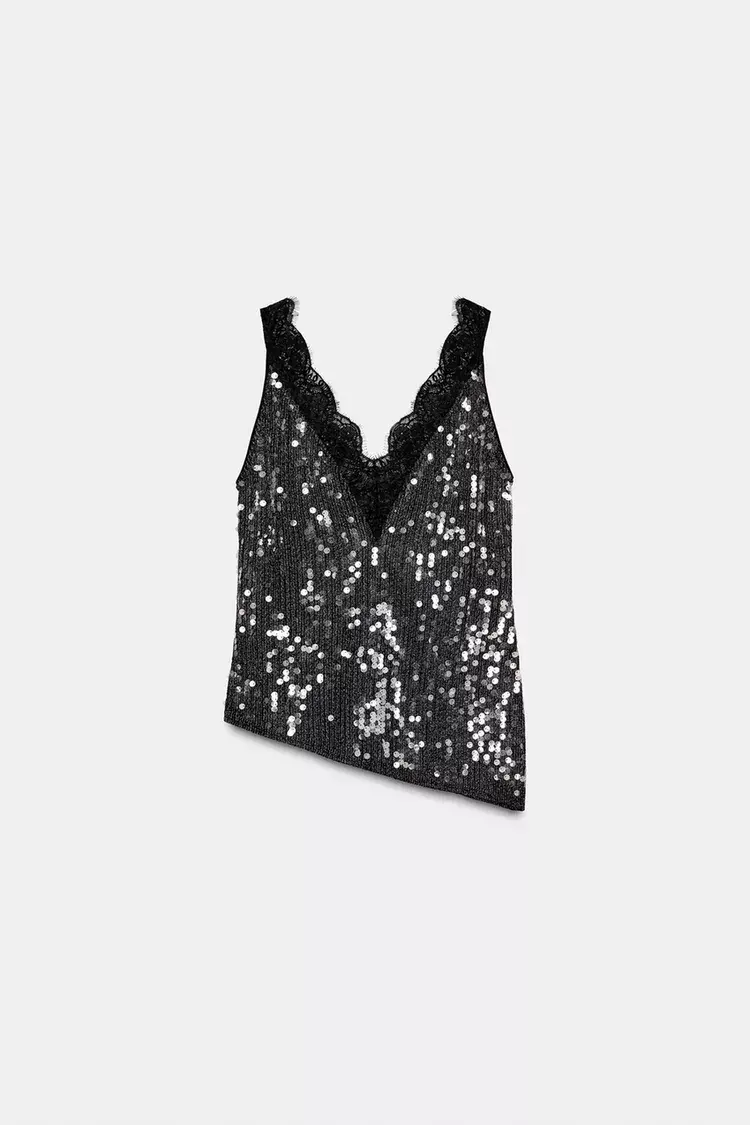 ZARA ТОП С ПАЙЕТКАМИ И КРУЖЕВОМ — ZW COLLECTION, ЧЕРНЫЙ