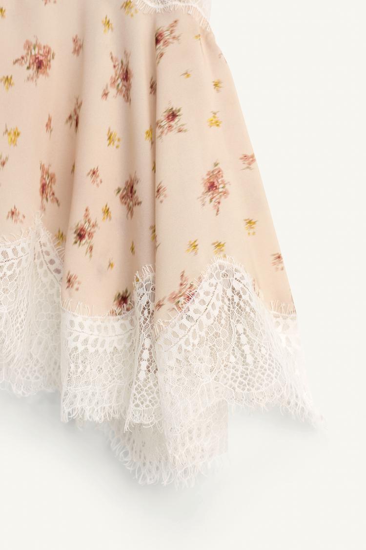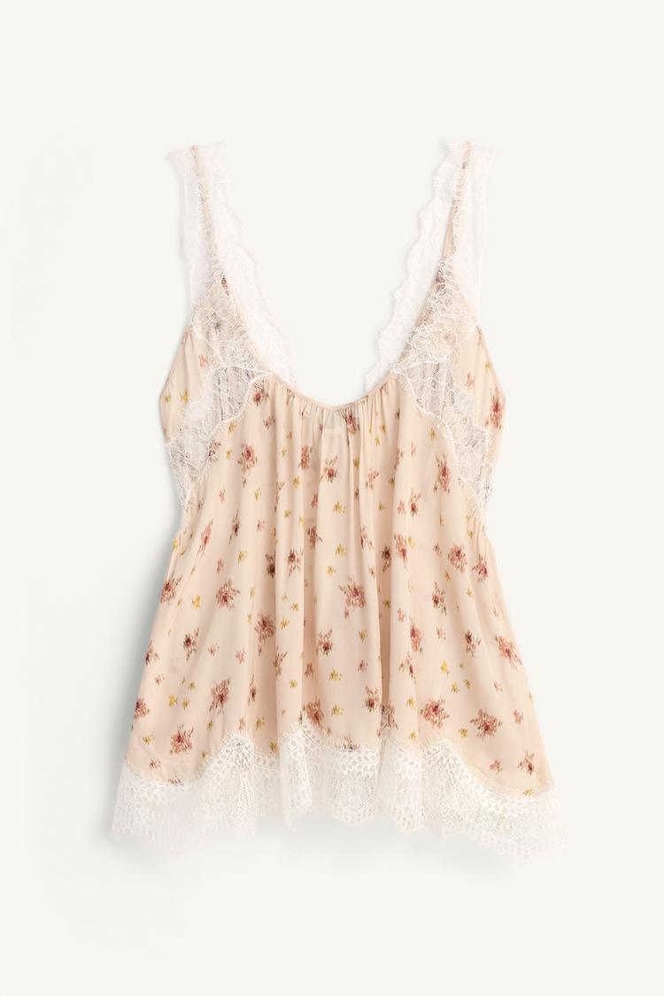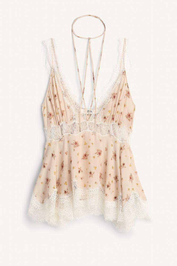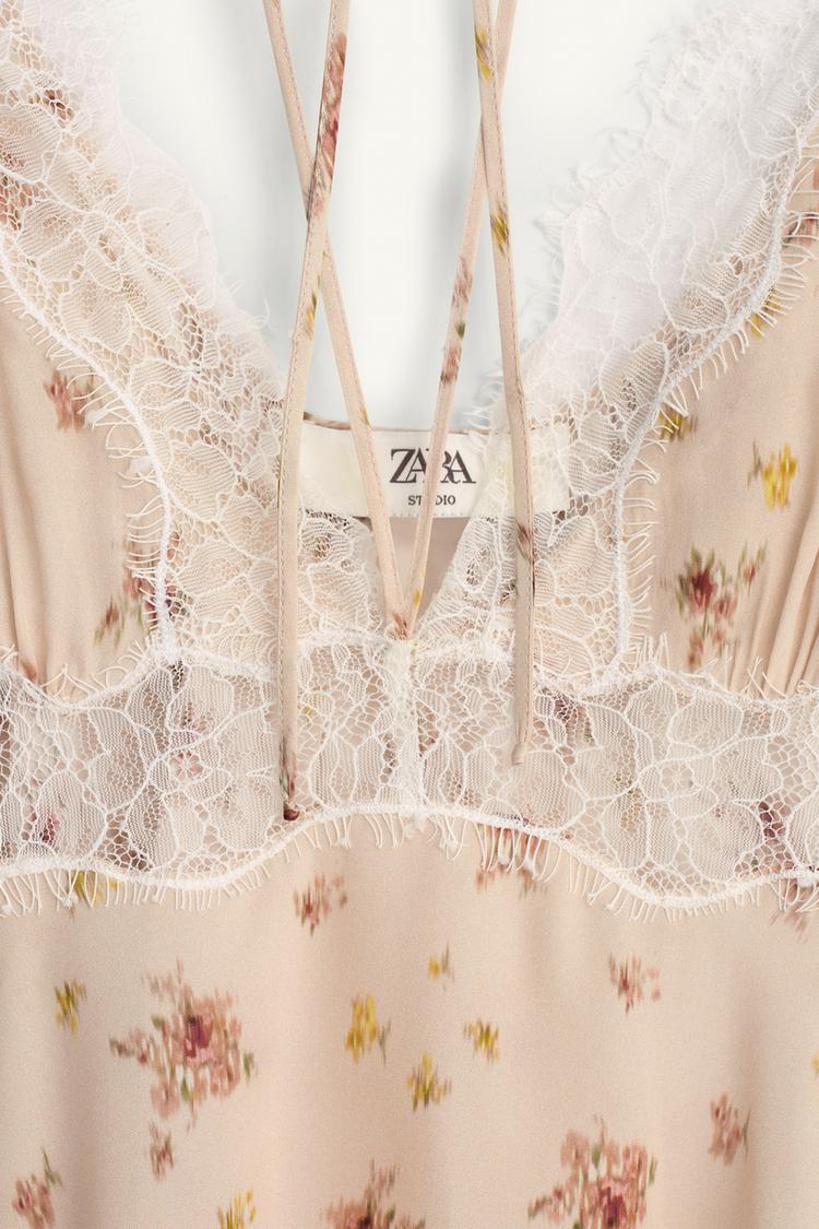 Завязывающийся, регулируемый V-образный вырез. Тонкие бретели. Контрастный кружевной и цветочный узор.
