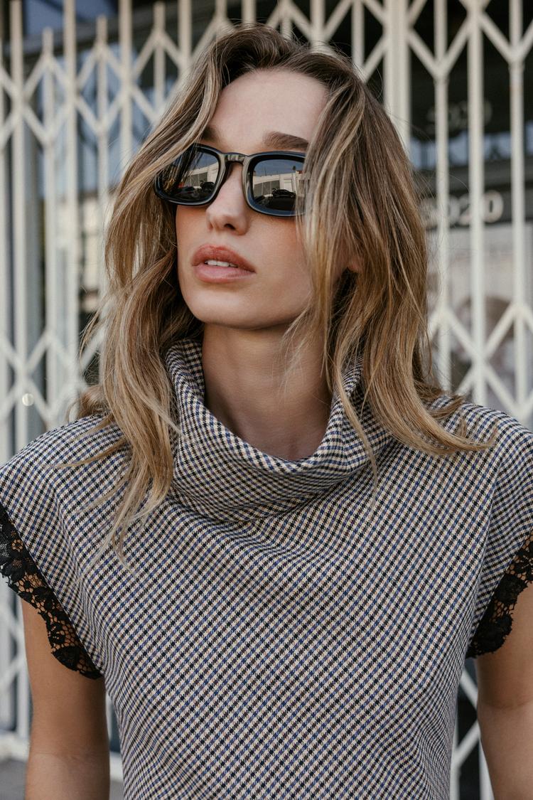 ZARA ТОП С УЗОРОМ «ГУСИНАЯ ЛАПКА» И КРУЖЕВОМ, ЭКРЮ/СИНИЙ