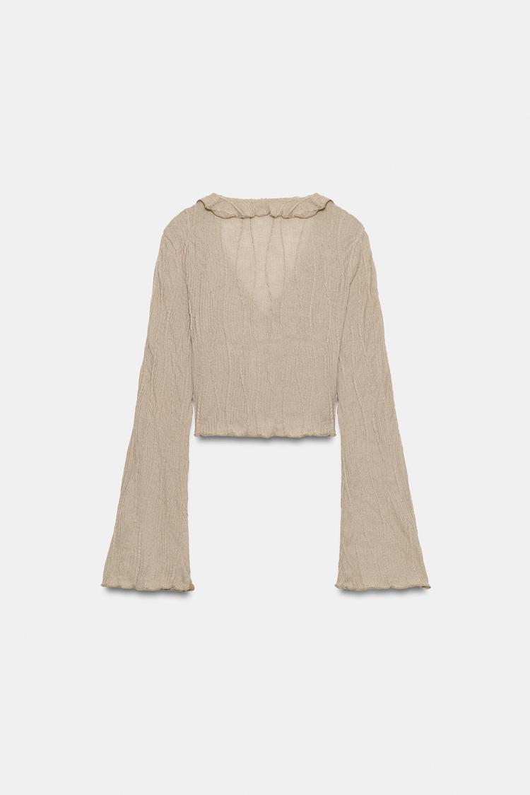 Укороченный топ с V-образным вырезом и длинными рукавами. Декоративная ткань с текстурой и воланами. Застежка спереди на завязках.