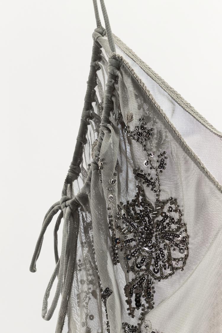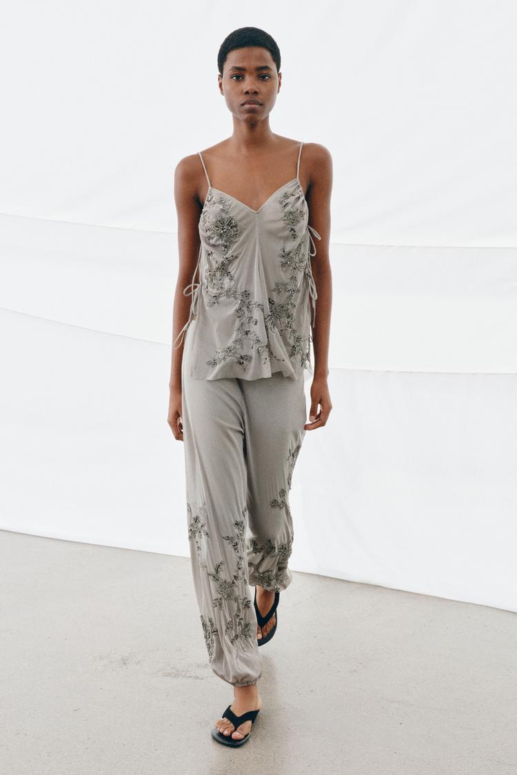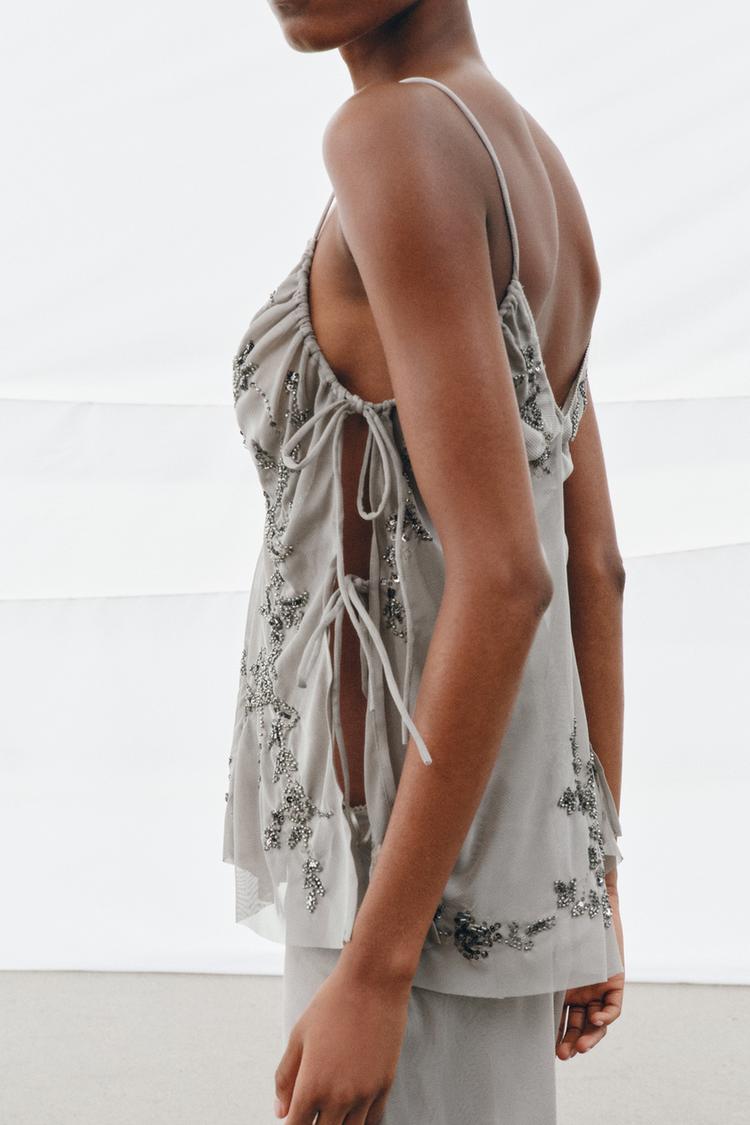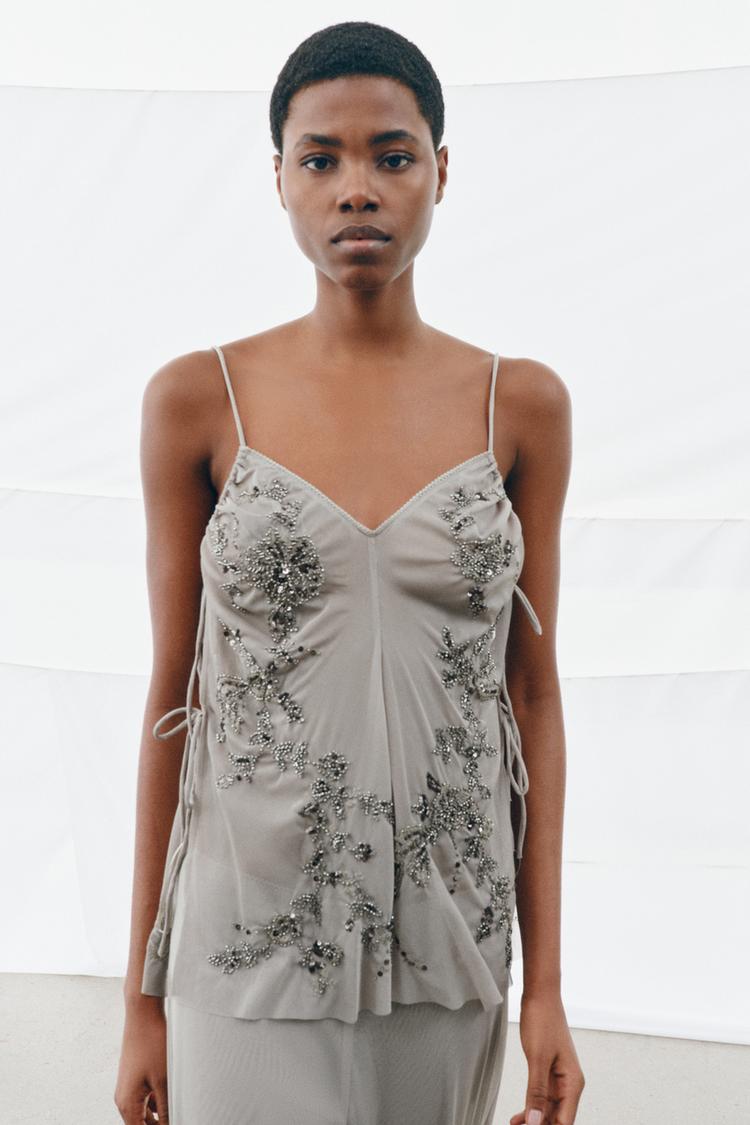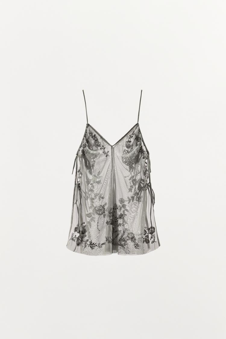 ZARA ТОП С ВЫШИВКОЙ И ПАЙЕТКАМИ, СВЕТЛО-СЕРЫЙ