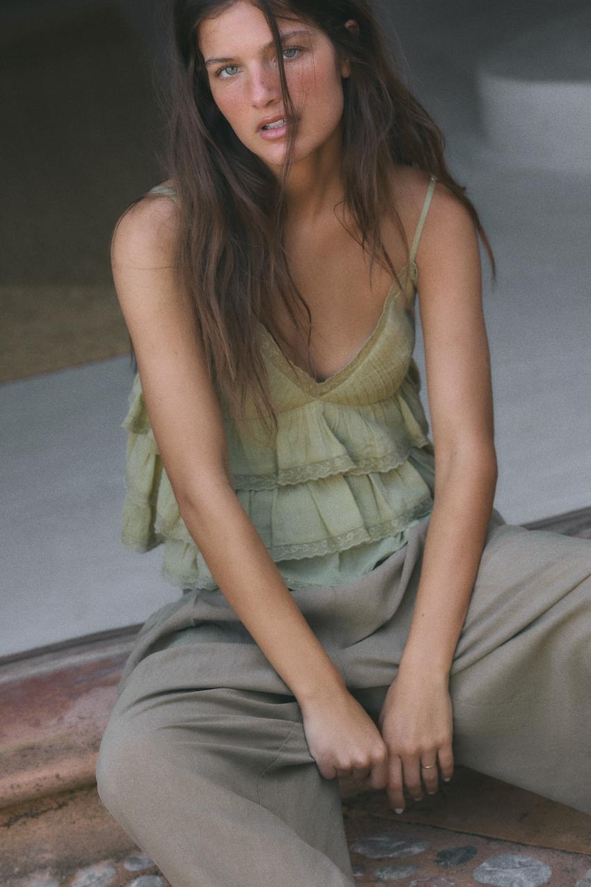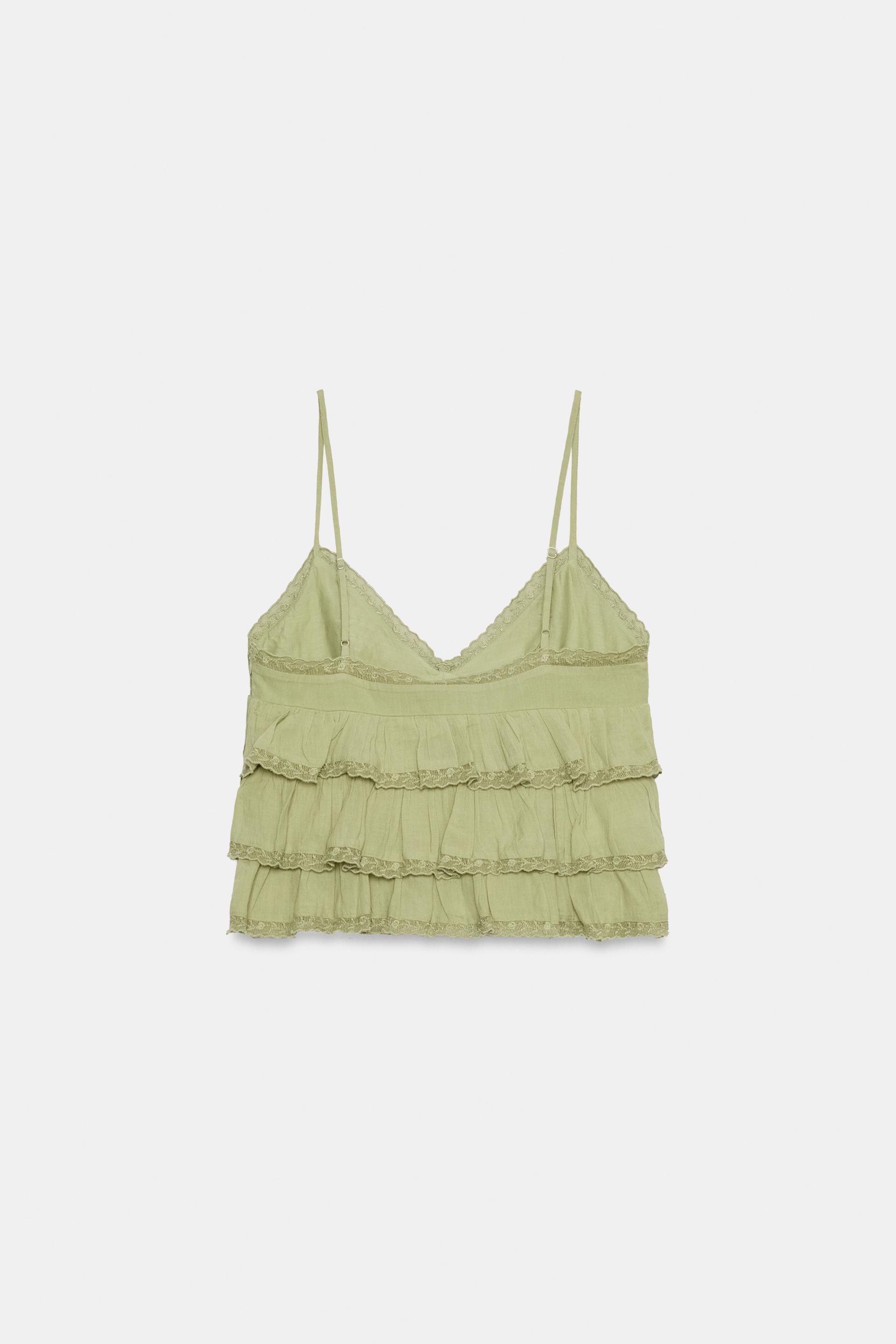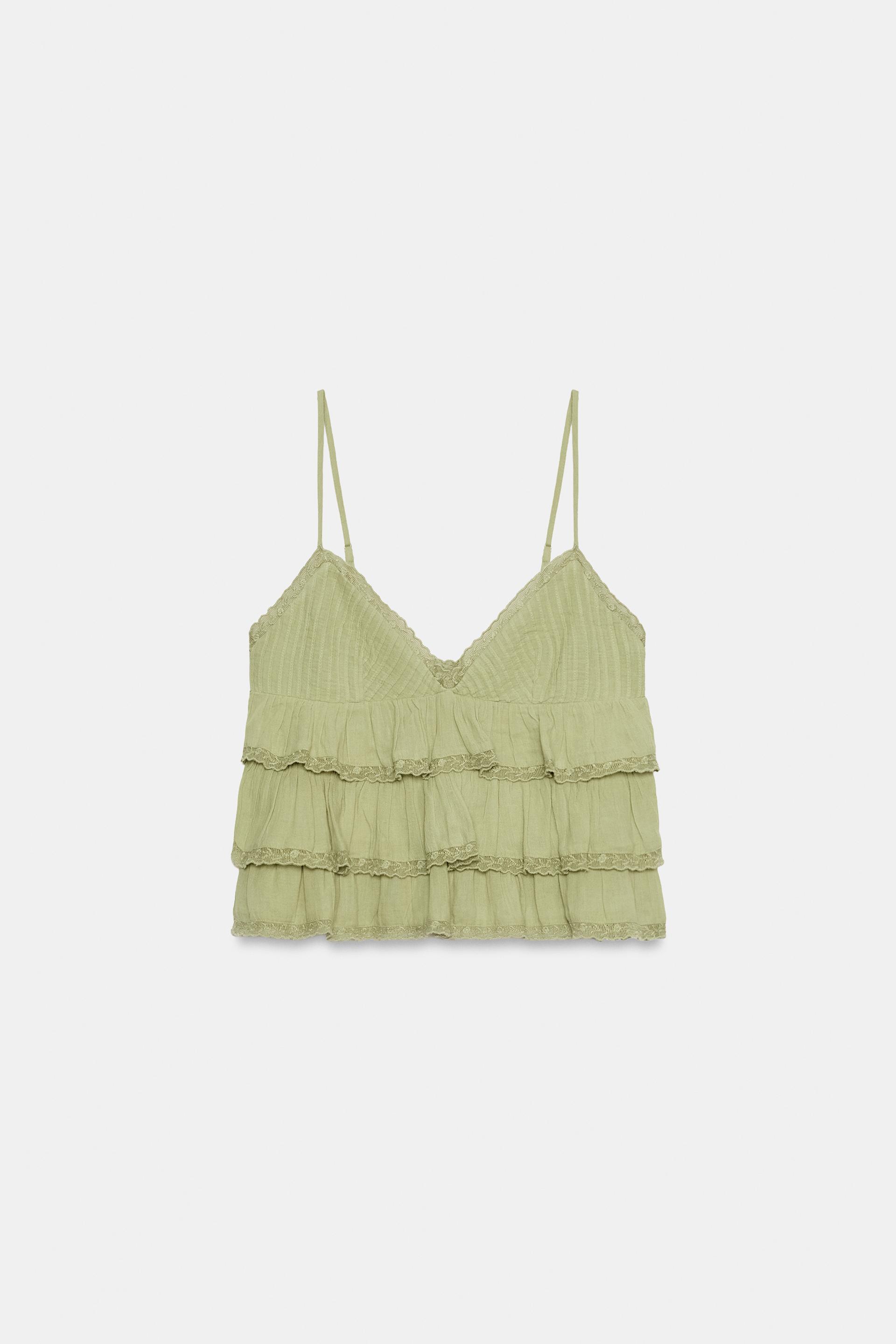 ZARA ТОП С ВЫШИВКОЙ И ВОЛАНАМИ, СВЕТЛО-ЗЕЛЕНЫЙ
