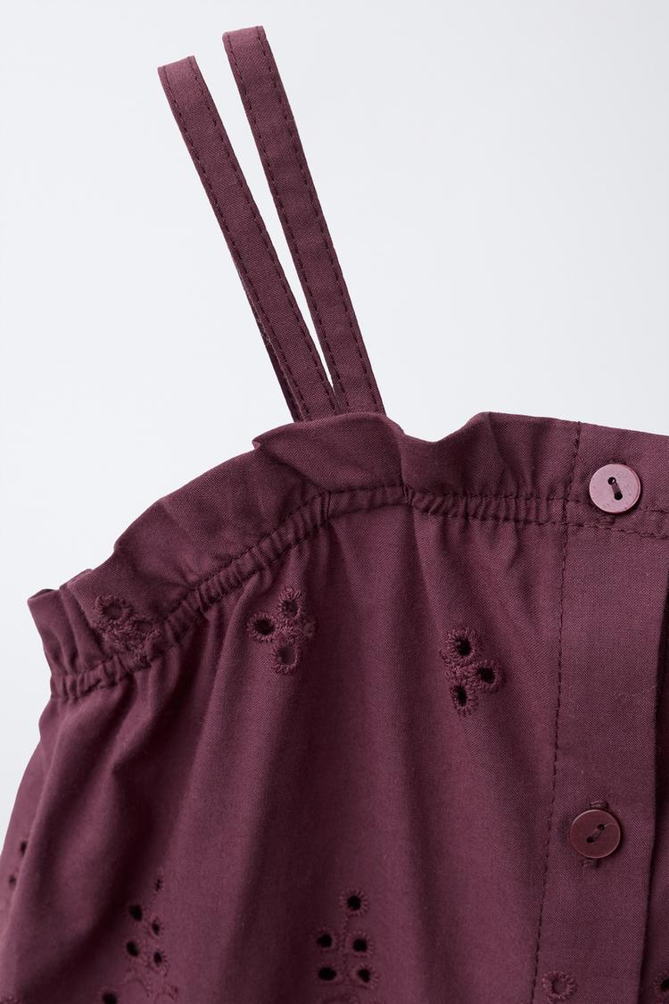 Топ с прямым вырезом и двойными бретелями. Застежка на пуговицы спереди. Вышивка шиффли.