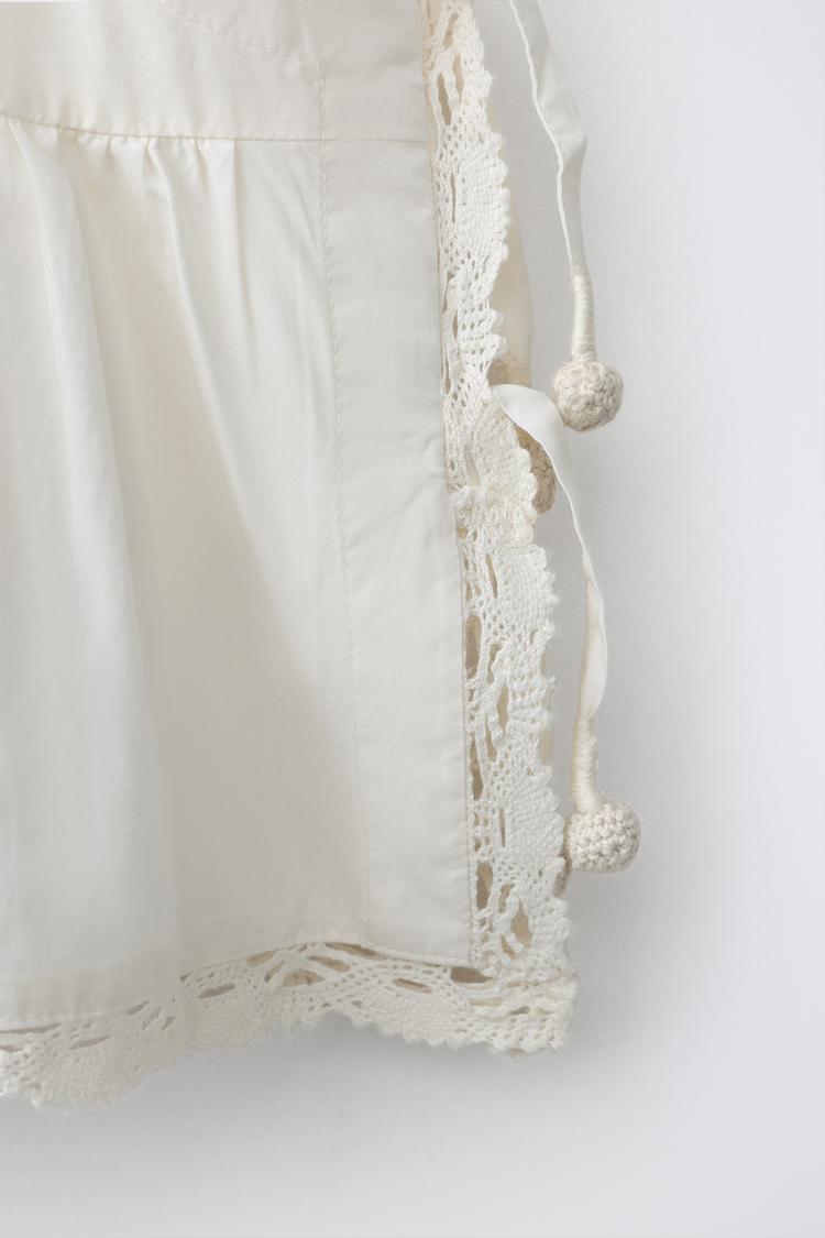 Топ с прямым вырезом и бретельками. Детали в виде складок и бантиков с кисточками по бокам. Низ с кружевной отделкой.