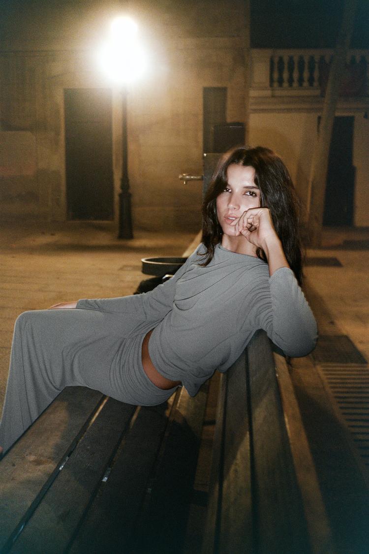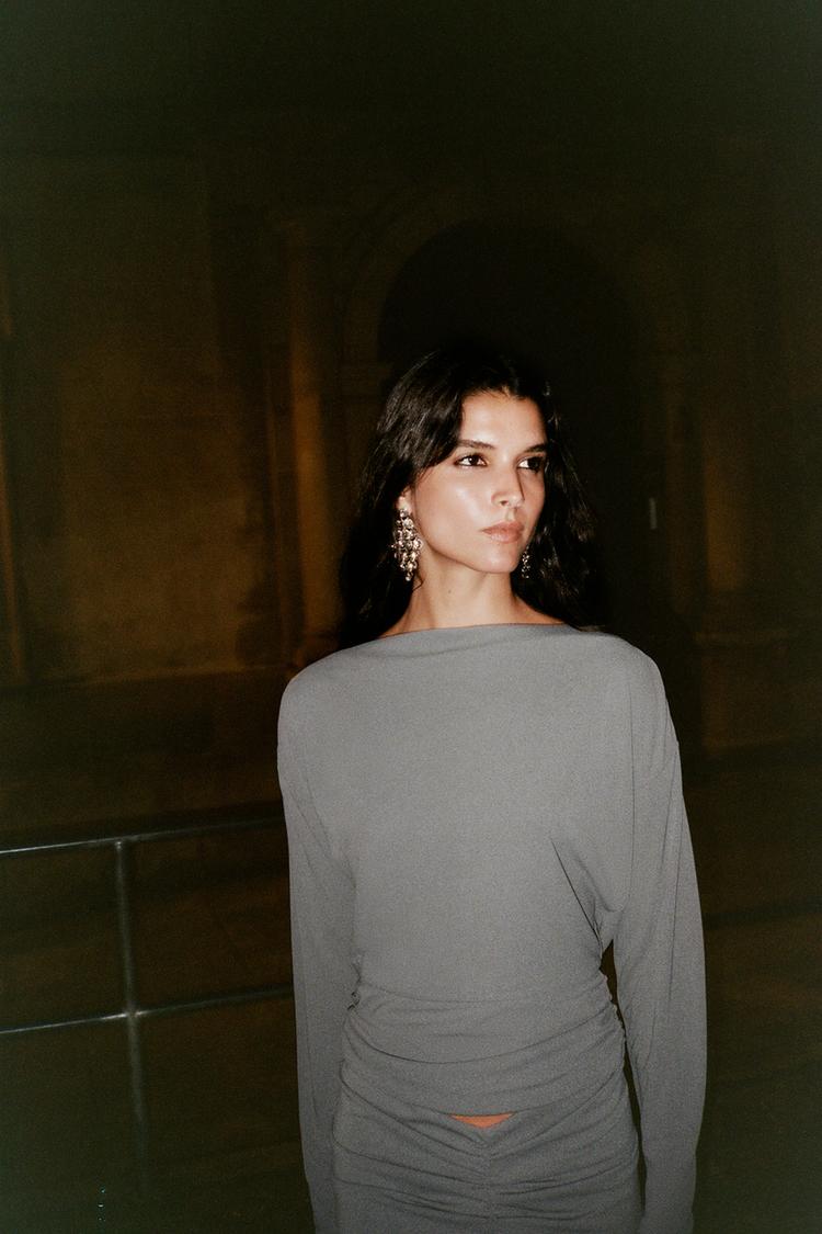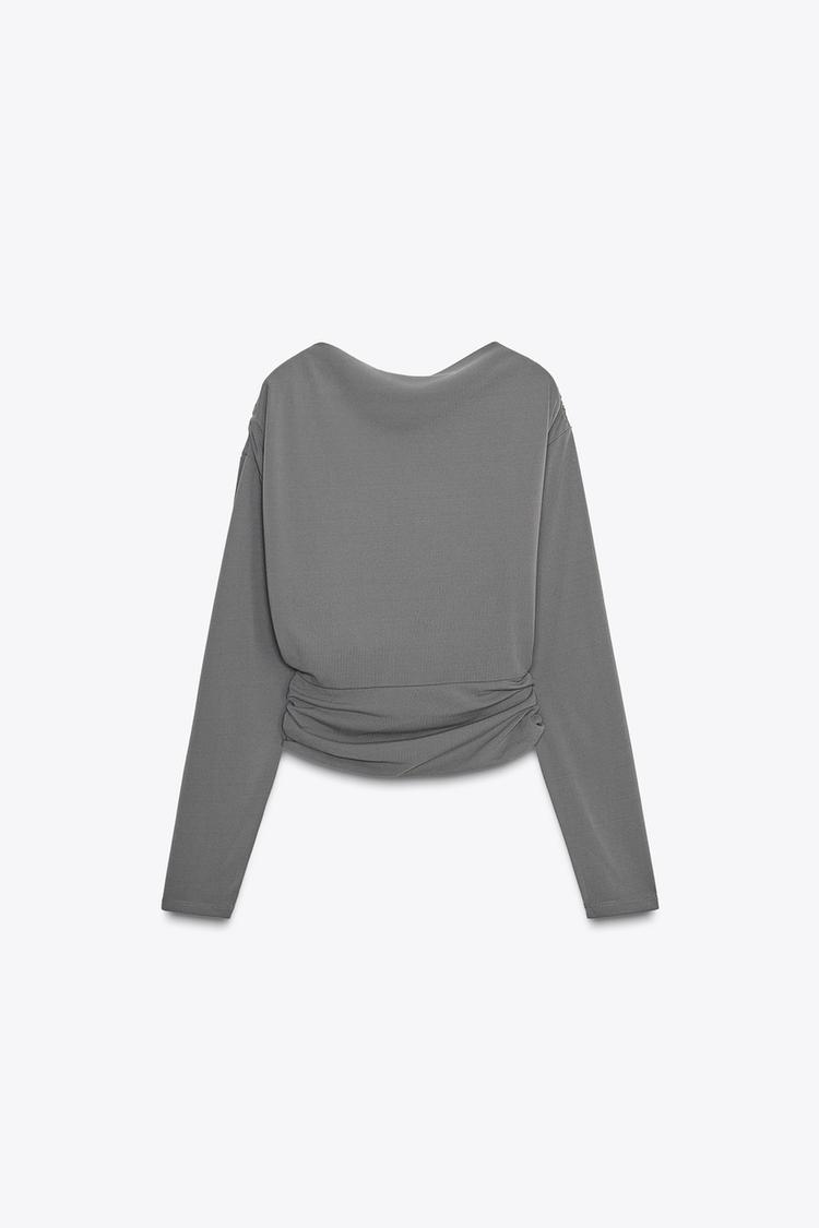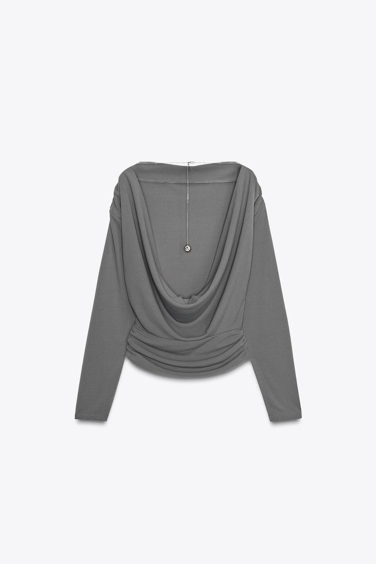 ZARA ТОП СО СБОРКАМИ, ОТКРЫТОЙ СПИНОЙ И УКРАШЕНИЕМ, СЕРЫЙ