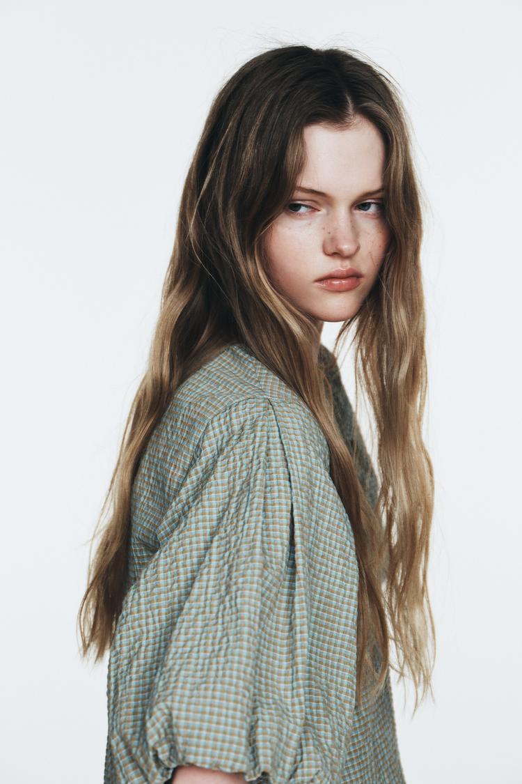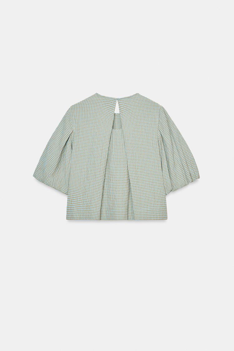 ZARA ТОП В КЛЕТКУ С ОБЪЕМНЫМИ РУКАВАМИ, КОРИЧНЕВО-СИНИЙ