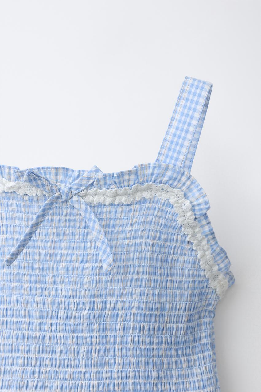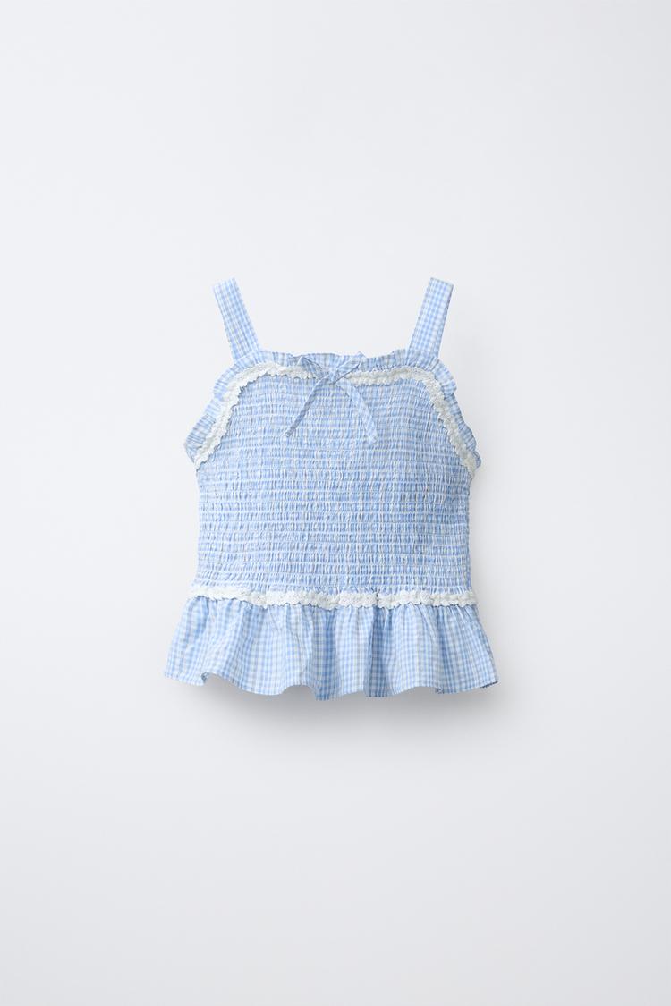 Топ с прямым вырезом и бретелями. Детали из резинок на кокетке спереди и сзади. Кружевная аппликация и бант спереди. Принт в клетку виши.