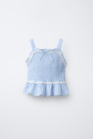 ZARA ТОП В КЛЕТКУ ВИШИ С РЕЗИНКАМИ, СИНИЙ/БЕЛЫЙ