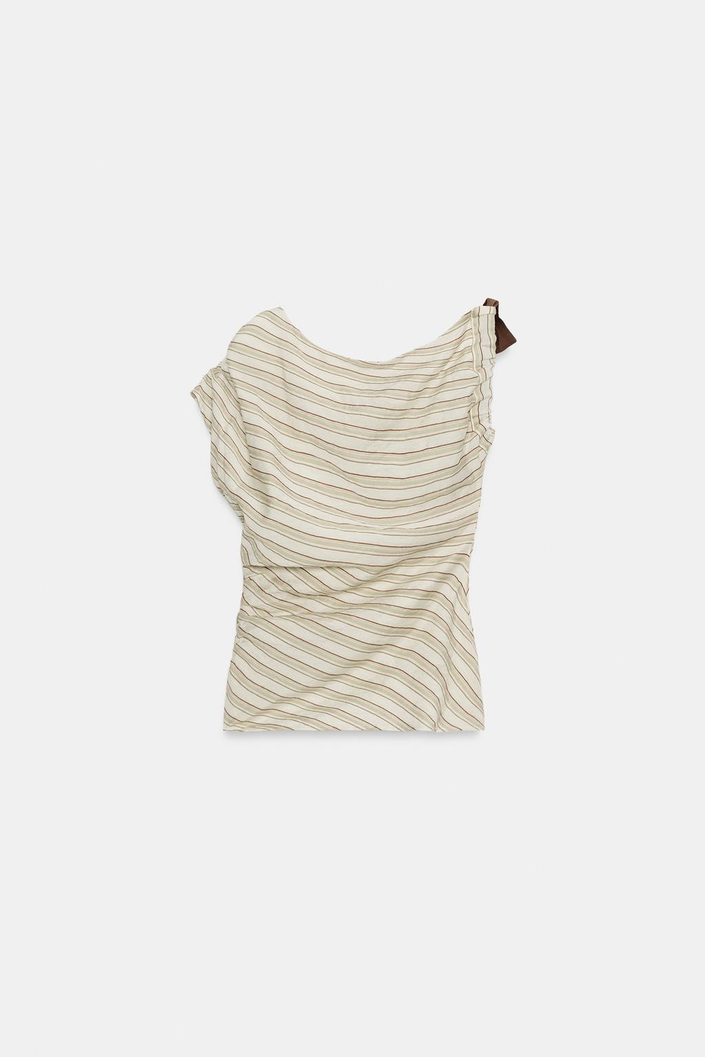ZARA ТОП В ПОЛОСКУ С БАНТОМ, ЭКРЮ/КОРИЧНЕВЫЙ